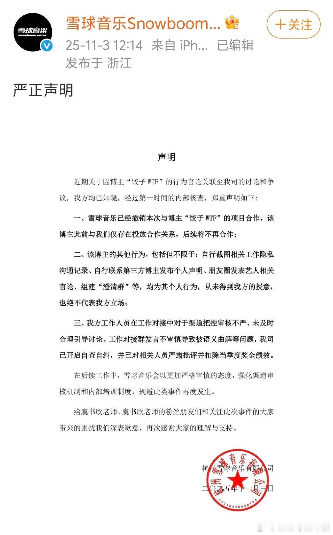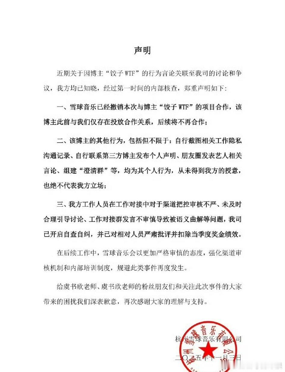 雪球音乐发声明,已经撤销和饺子的合作,并向虞书欣和虞书欣粉丝道歉。