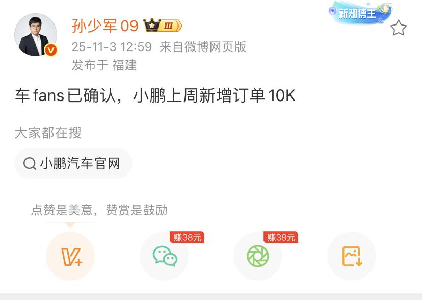 孙少军:车fans已确认,小鹏上周新增订单10K ! 小鹏汽车的表现真的是相当的可以。值得注意的是,小鹏的增程产品还没上来,等小鹏的增程产品上的,就会让大家意识到什么是可怕。 本身小鹏的产品能力就非常的强,在增程产品一上,那不得卖爆呀。很多人担心的就是纯电不耐开,特别是有些人老家离工作地很远,纯电车有时候适用性不那么大,增程车一来就不一样了。 各位是怎么看的?欢迎评论区留言。