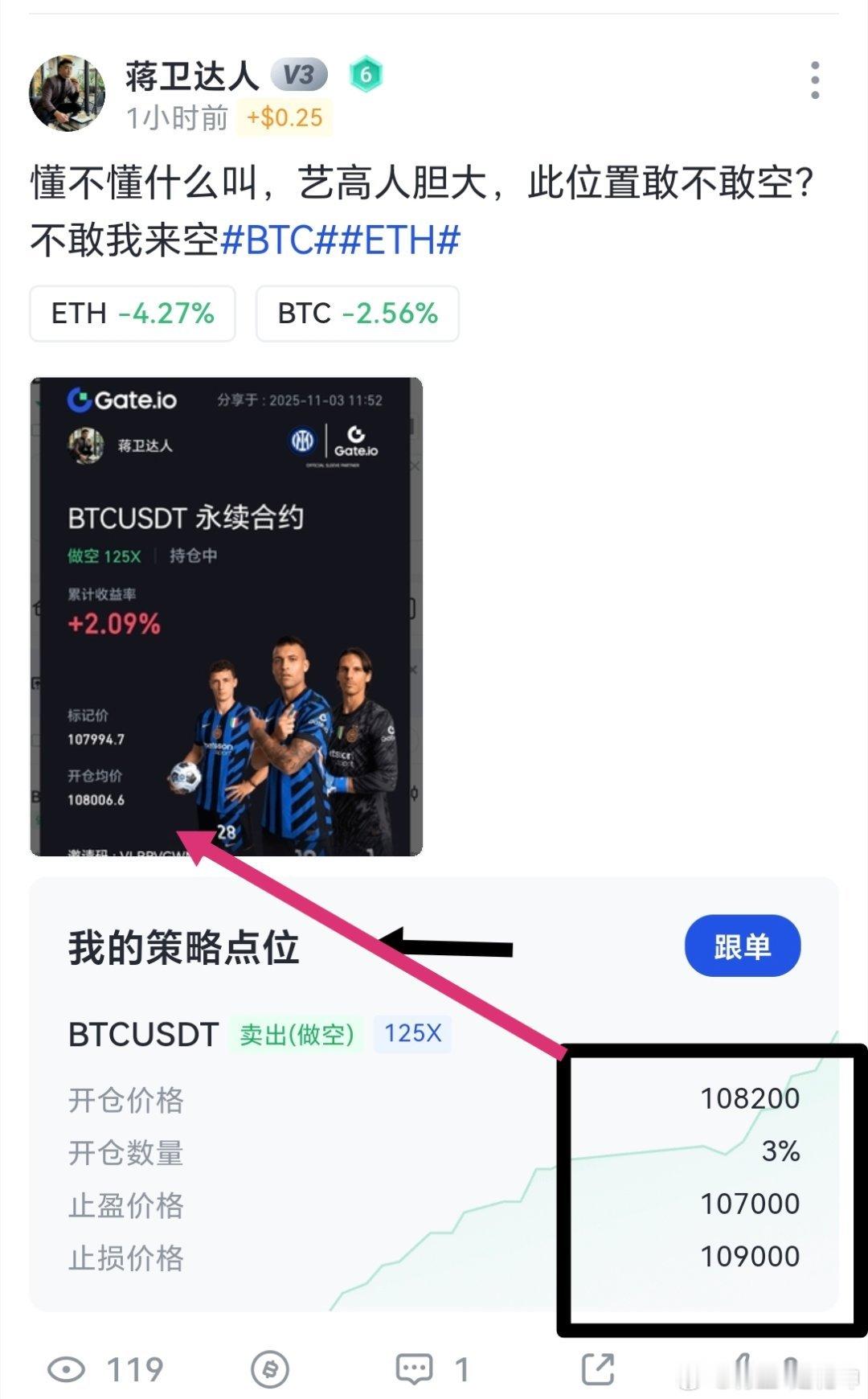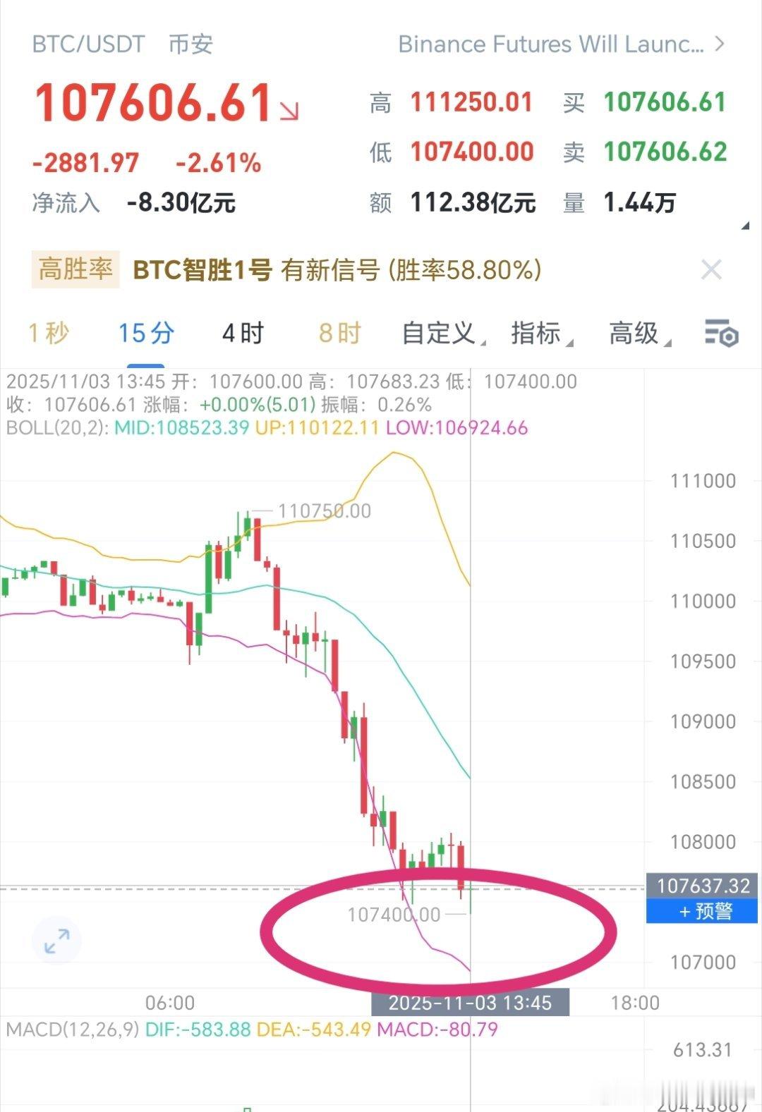 空头强势回落。108000附近,直接喊话做空,最低回踩107300附近,空頭700点。