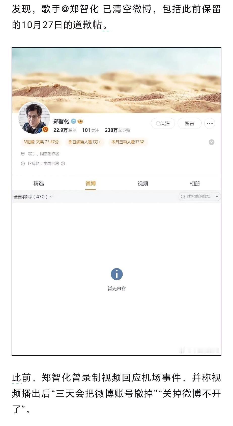 郑智化,还挺刚的[笑哭] 直接清空了微博, 所有发文,还有道歉小作文统统删了。 应该是私信爆了,不堪其扰了吧?只能说公众人物如果没有强大的心脏和心理素质,在网络上最好是潜水。[呲牙]