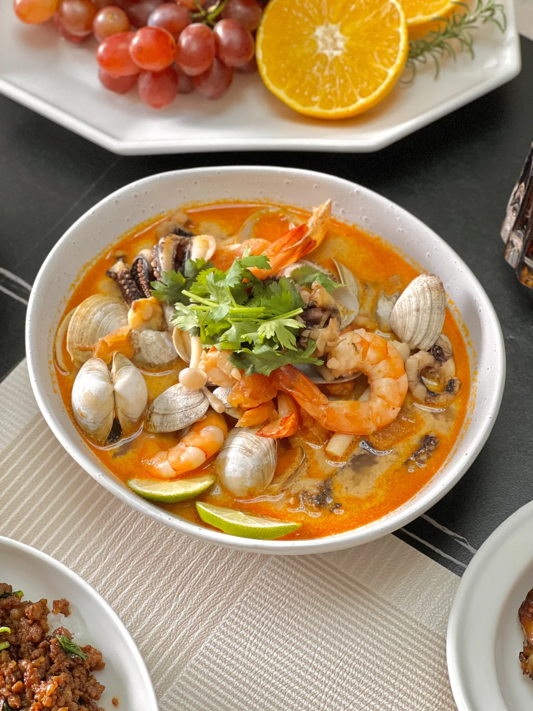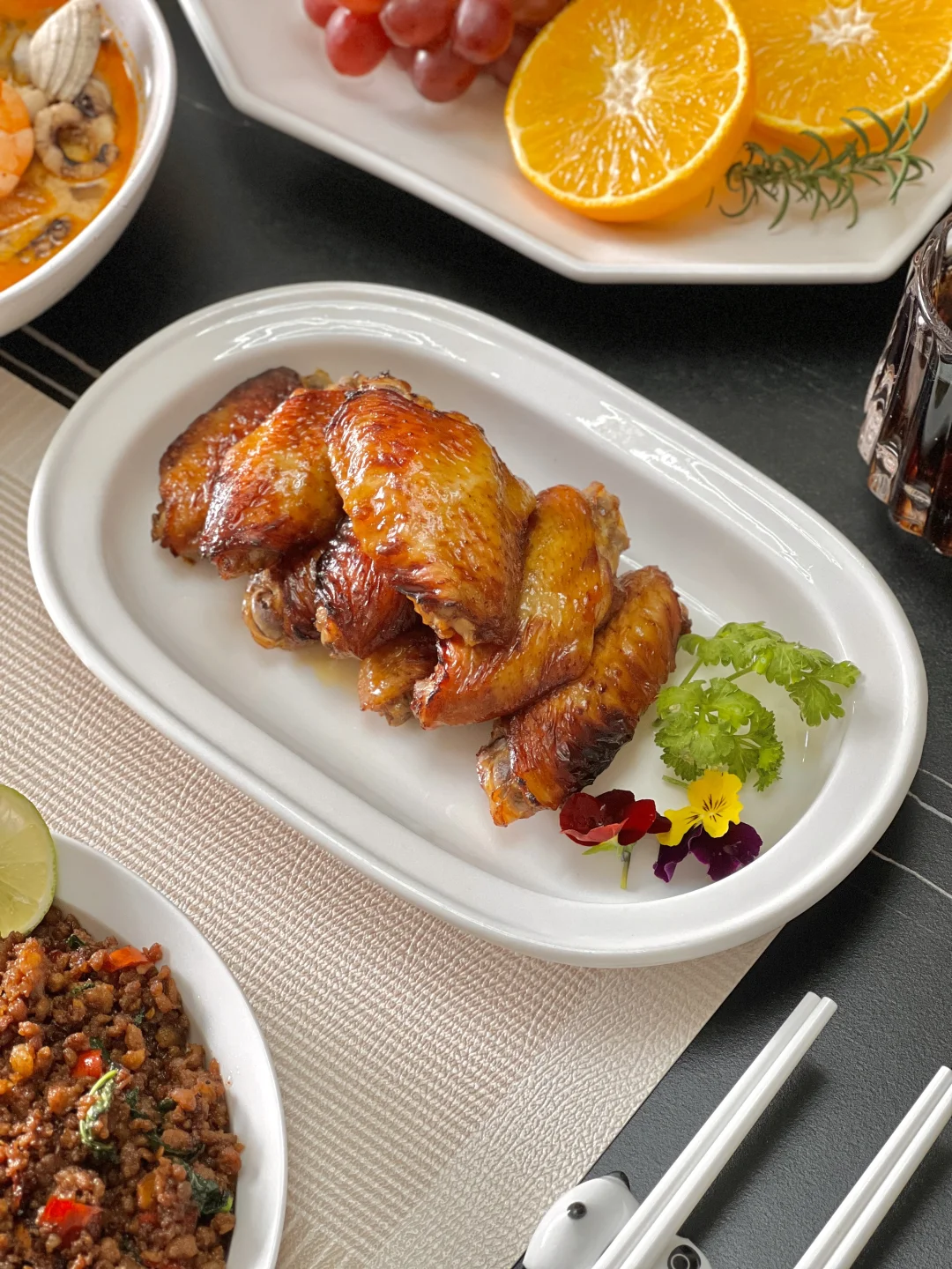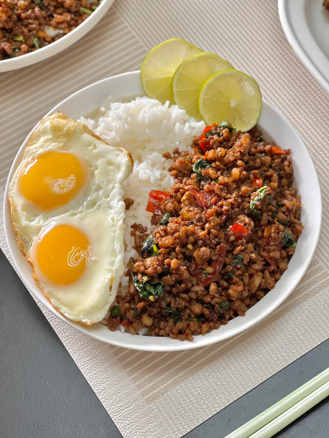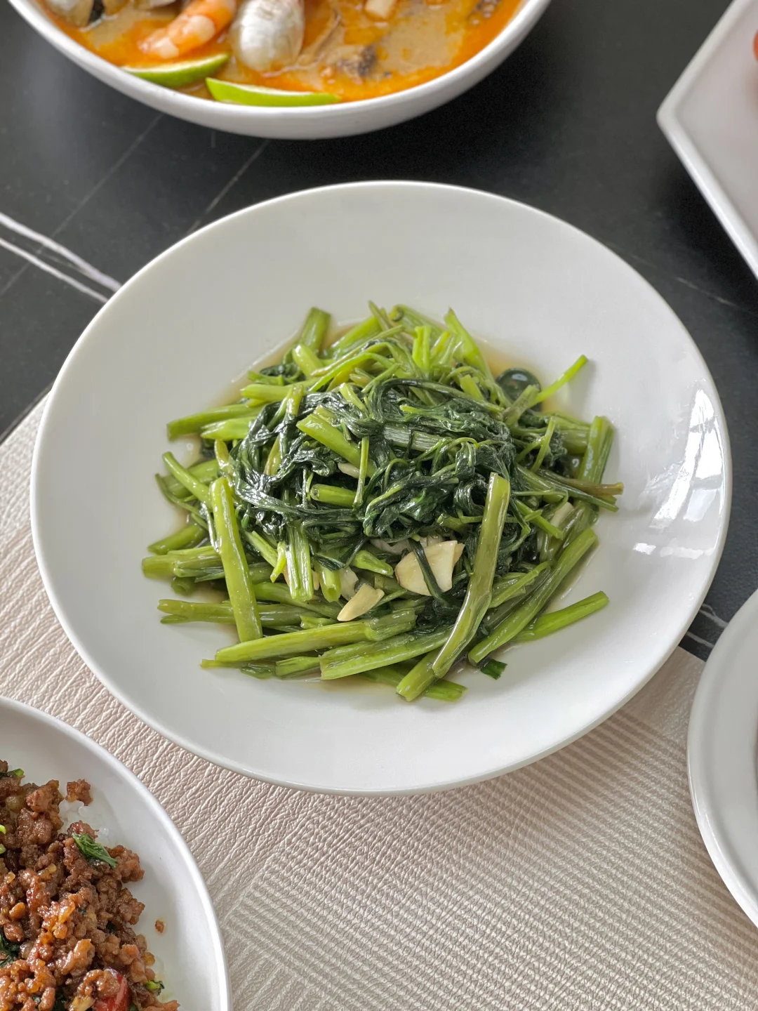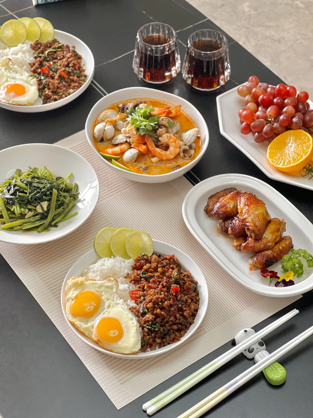 爱吃泰式打抛饭的小伙伴快来,鉴定一下我今天做的怎么样[大笑R]新鲜的肉末裹满秘制打抛酱,辣中透着罗勒独特的香气,拌上热乎乎的米饭,每粒米都吸满酱汁,辣辣的好过瘾[派对R]冬阴功汤和鸡翅也是我每次吃泰国料理爱点的,自己在家也能吃到啦~ 【泰式打抛饭】 【冬阴功汤】 【蜜汁烤鸡翅】 【蒜蓉空心菜】