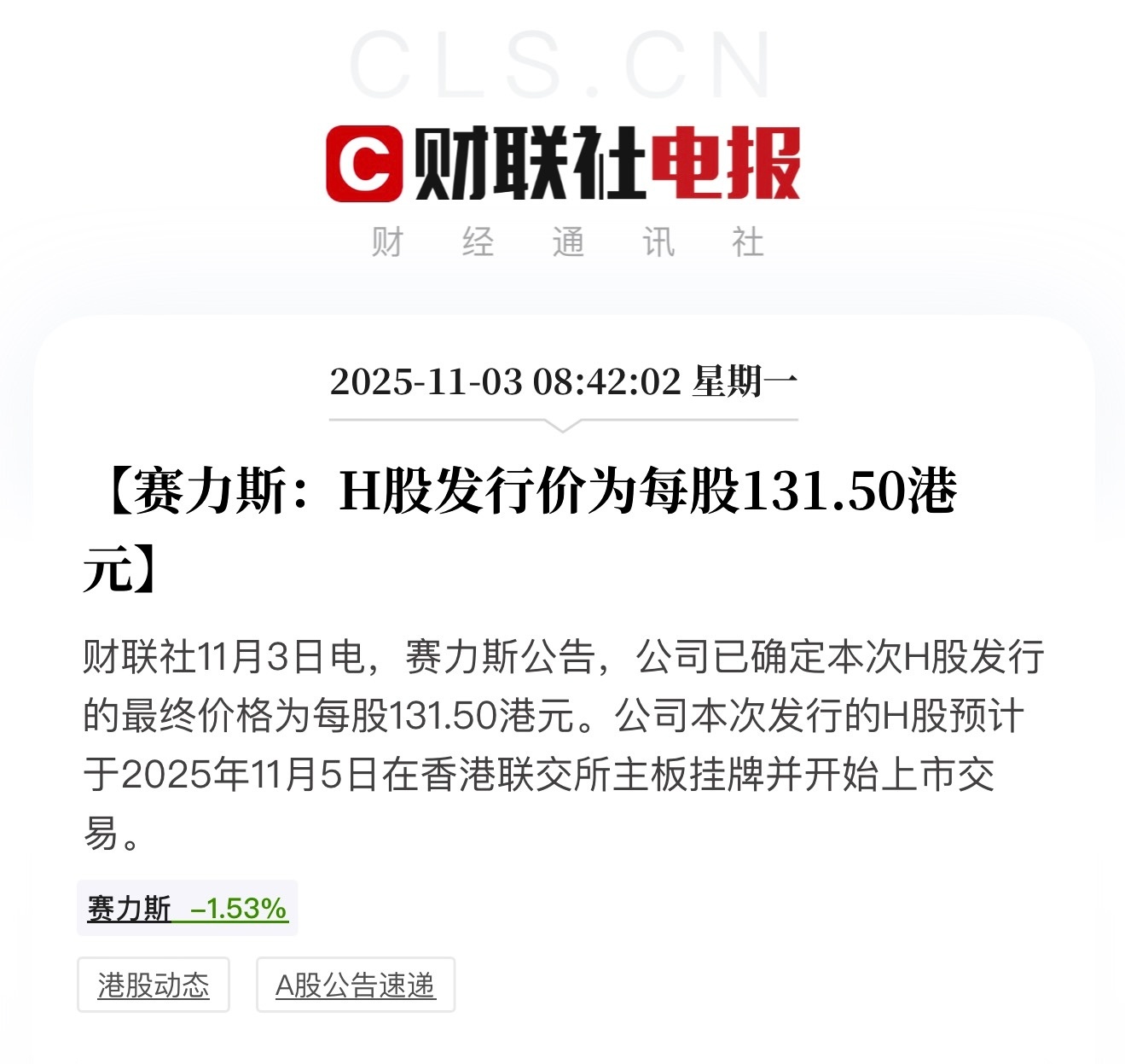 赛力斯公告:H股发行价定在每股131.50港元,11月5号在香港联交所主板上市交易。