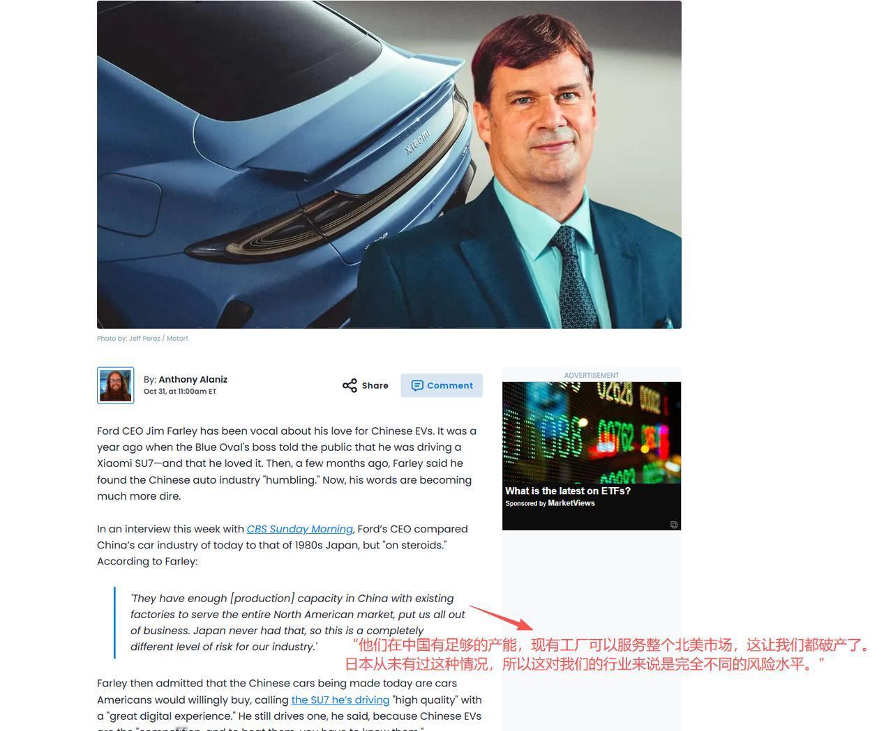 【福特CEO:中国可以 “让我们所有人都停业”】福特首席执行官吉姆·法利 (Jim Farley):他们在中国有足够的产能,现有工厂可以服务整个北美市场,这让我们都破产了。日本从未有过这种情况,所以这对我们的行业来说是完全不同的风险水平。