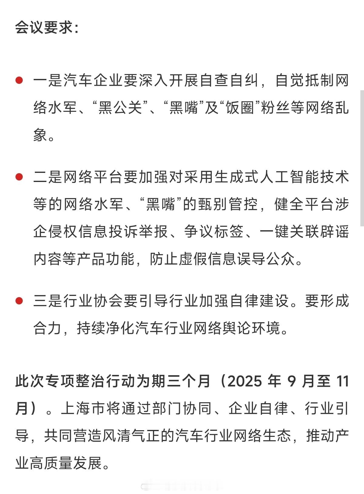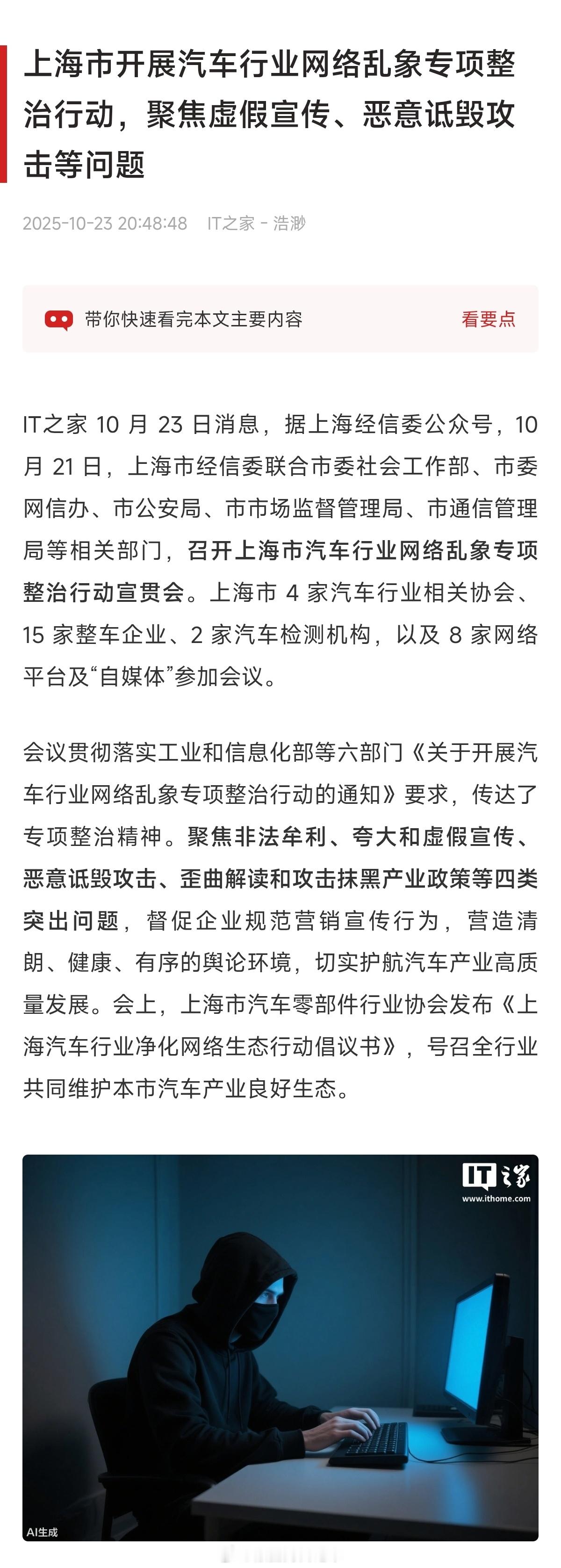上海市开展汽车行业网络乱象专项整治行动,聚焦虚假宣传、恶意诋毁攻击等问题。