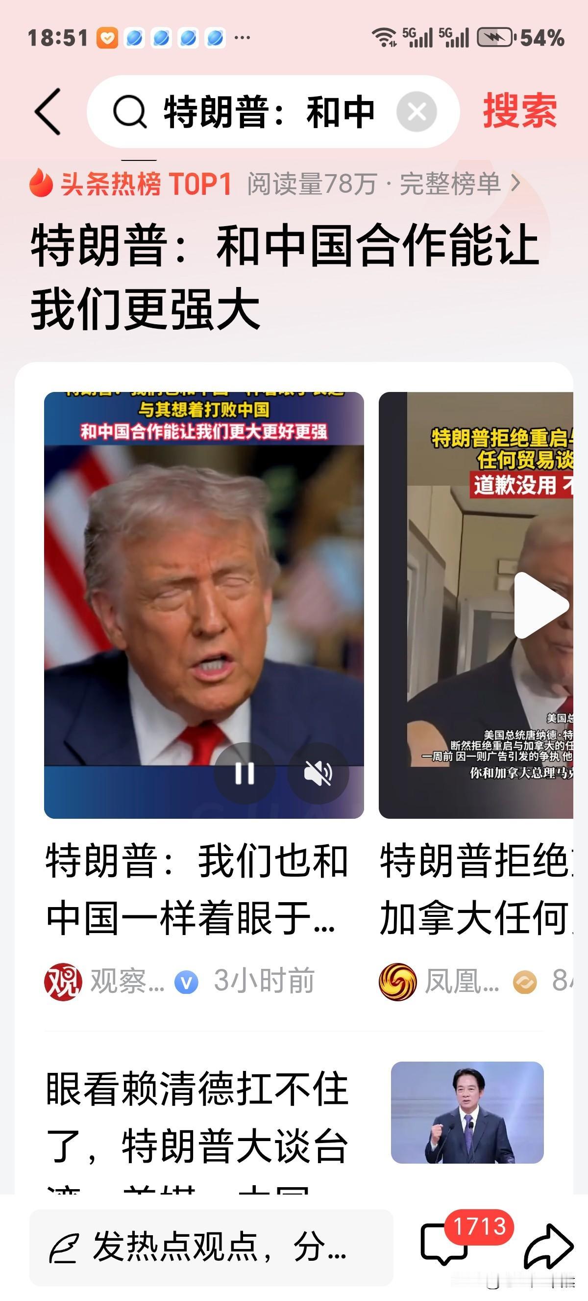 特朗普想和中国合作,这能是真心话吗?我看应该是!理由是老特尝试了关税战,打不赢。动武亮肌肉,耀武扬威,战机不听使唤,往海里坠。咋整?唯有和咱合作方可共赢。 再有西方国家人不傻,知道自己能力大小,有自知之明。故而崇拜强者吗!况且老特头上个任期确实没打仗。由此我认为特朗普话是真的! 那咱也自然希望合作共赢了,中国和平崛起是首选。关键中华民族自古便热爱和平。如:不战屈人之兵。和人不犯我我不犯人!等文化底蕴。 综上所述,笔者希望特朗普总统,言行一致,为世界和平,为中美合作做出贡献,毕竟中国复兴,不影响美国伟大!地球够大完全能容纳两个伟大盛世大国。