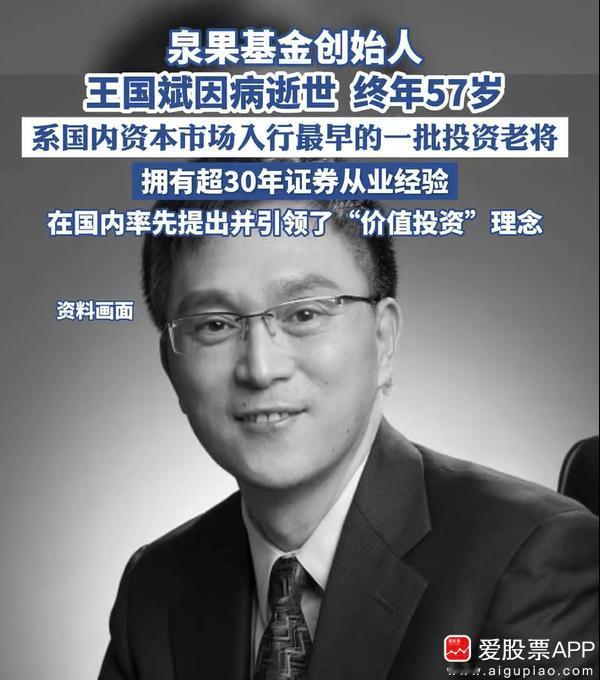 金融圈大佬,泉果基金创始人之一王国斌去世,终年57岁!据说是突发疾病,真的太年轻了啊。 王国斌不是普通的基金经理,他是“A股最成功的价值投资者之一”。敢于重大节点敢于发声,如在2007年、2015年公开提示泡沫风险,主动关闭产品;同时在大A极度低迷又敢于逆势而上,被业内广为赞誉。 他带领的基金业绩都不错,成立至今均为正收益!这说明了,A股并不是只有投机,搞价投也是有前途的,关键是做到知行合一。 说真的,做投资压力还是蛮大的,不管是大佬还是普通的散户,总有暂时不顺、总有逆风的时刻。所以,一定要注意身体,不要过度反思,善待自己!A股本来就是很极端的市场,急也急不来,耐心等待你的风来。 祝大家都有个好身体,说个事儿,巴菲特95岁了,他95%的财富都是60岁以后赚的。所以只要活着够久,就有牛市的希望。