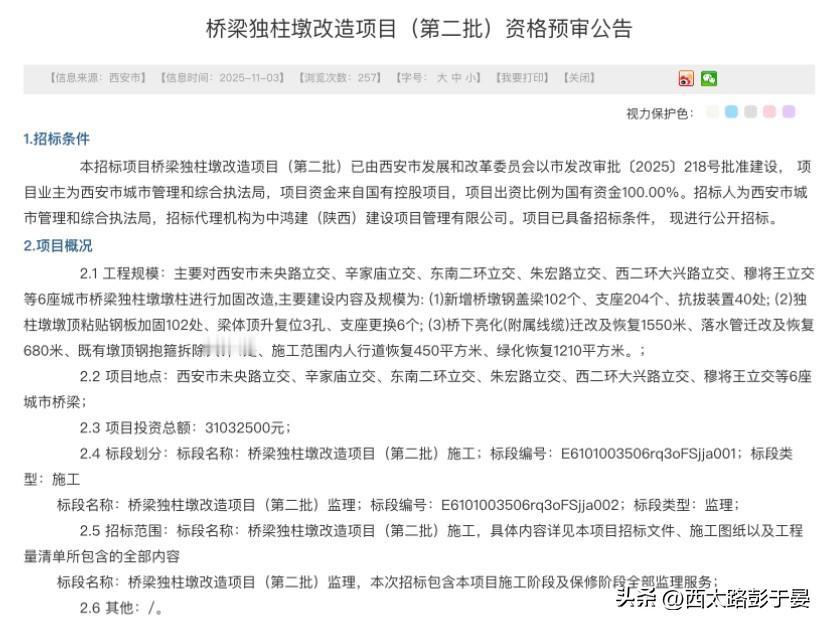 西安6座立交将迎独柱墩改造!投资超3100万,涉及这些关键工程 未央路立交、辛家庙立交等6座城市重要立交,即将启动独柱墩改造(第二批)项目,目前资格预审公告已发布,工程投资总额达3103.25万元! 此次改造聚焦桥梁安全与功能优化,核心工程内容超实在: 结构加固:新增102个桥墩钢盖梁、204个支座、40处抗拔装置,同时对102处独柱墩墩顶粘贴钢板加固; 细节修复:完成3孔梁体顶升复位、6个支座更换,拆除4处既有墩顶钢抱箍; 配套恢复:迁改并恢复1550米桥下亮化线缆、680米落水管,还将修复450平方米人行道、1210平方米绿化。 改造涉及未央路立交、辛家庙立交、东南二环立交、朱宏路立交、西二环大兴路立交、穆将王立交,均为西安交通关键节点。项目落地后,将进一步提升桥梁承载安全,改善通行环境,期待早日完工!