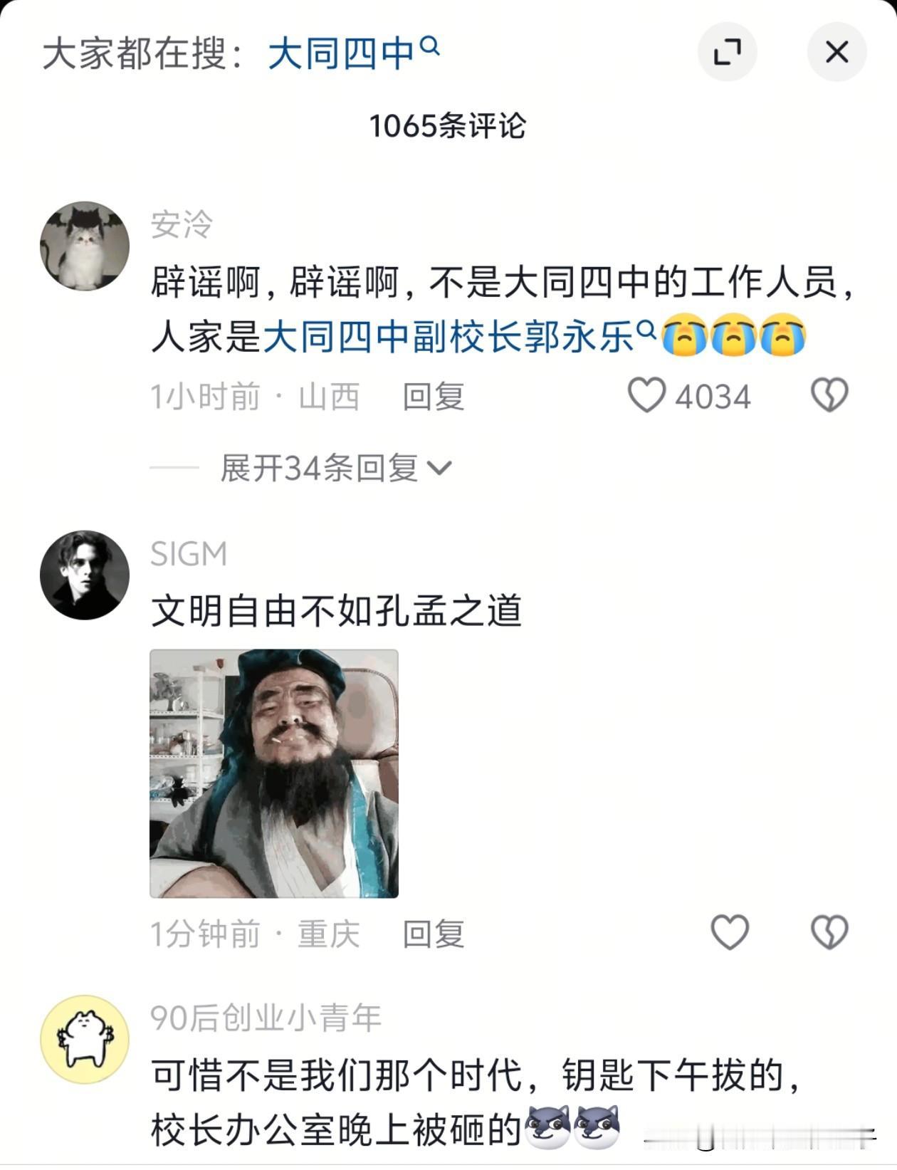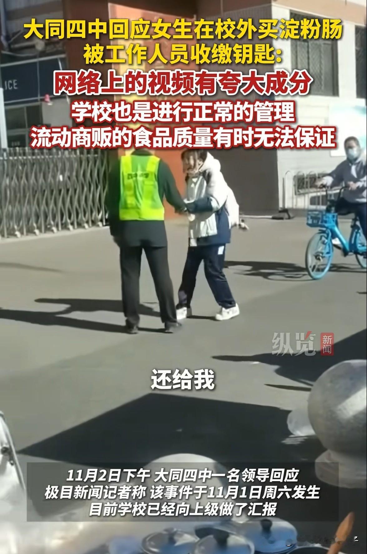山西大同四中,原来在校门口抢女生钥匙的并不是保安,而是学校副校长 ,难怪学校回应很敷衍,只是说有人正在处理此事,但却丝毫没有提及拿钥匙的人员信息。 给出的理由也挺离谱的,说校外的小摊的食品质量无法保证,且不说校内的就一定有保证,网上爆出的关于校内食堂卫生问题事件还少吗? 还说网络流传的视频有夸大成分,就更有意思了,这意思视频是AI合成的? 要是女生在校内吃零食,怎么管理都可以,但是已经放学了,就因为在校门口买根淀粉肠,就被强行拿走电动车钥匙和家钥匙,这做法未免太离谱了! 据说,后续把女生单独叫到办公室,批评教育了好一顿才让其离开。 虽然大同四中的回应让人寒心,但四中的同学却很暖心,这事过后,不少男同学组团去买淀粉肠,还表示就爱吃淀粉肠,用自己行为为女生抱不平!