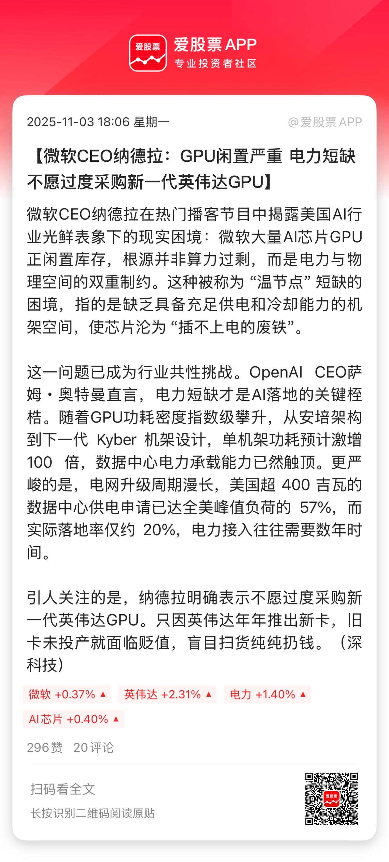 今晚发酵最多的,AI发展的终点是电力,美国电不够用,买了大量的GPU闲置着!老美发展人工智能遇到麻烦了,存储和电力成为制约数据中心建设的最大瓶颈。 中国不缺电,这几年大量建设风电光伏电站,还在研发新一代核电。另外我们在电力设备领域全球领先,变压器(固态变压器)+储能优势很大! 总结就是,中国缺芯,美国缺电。中美之间是互补的,美国对我们电力设备进口必然增加!这就是特变电工、阳光电源股价这么疯狂的原因,目前确实是高景气。 爱股君想说,有庞大的电力基础设施,未来我们AI会不会像新能源车一样,实现对美国的弯道超车!这种可能性还是有的。
