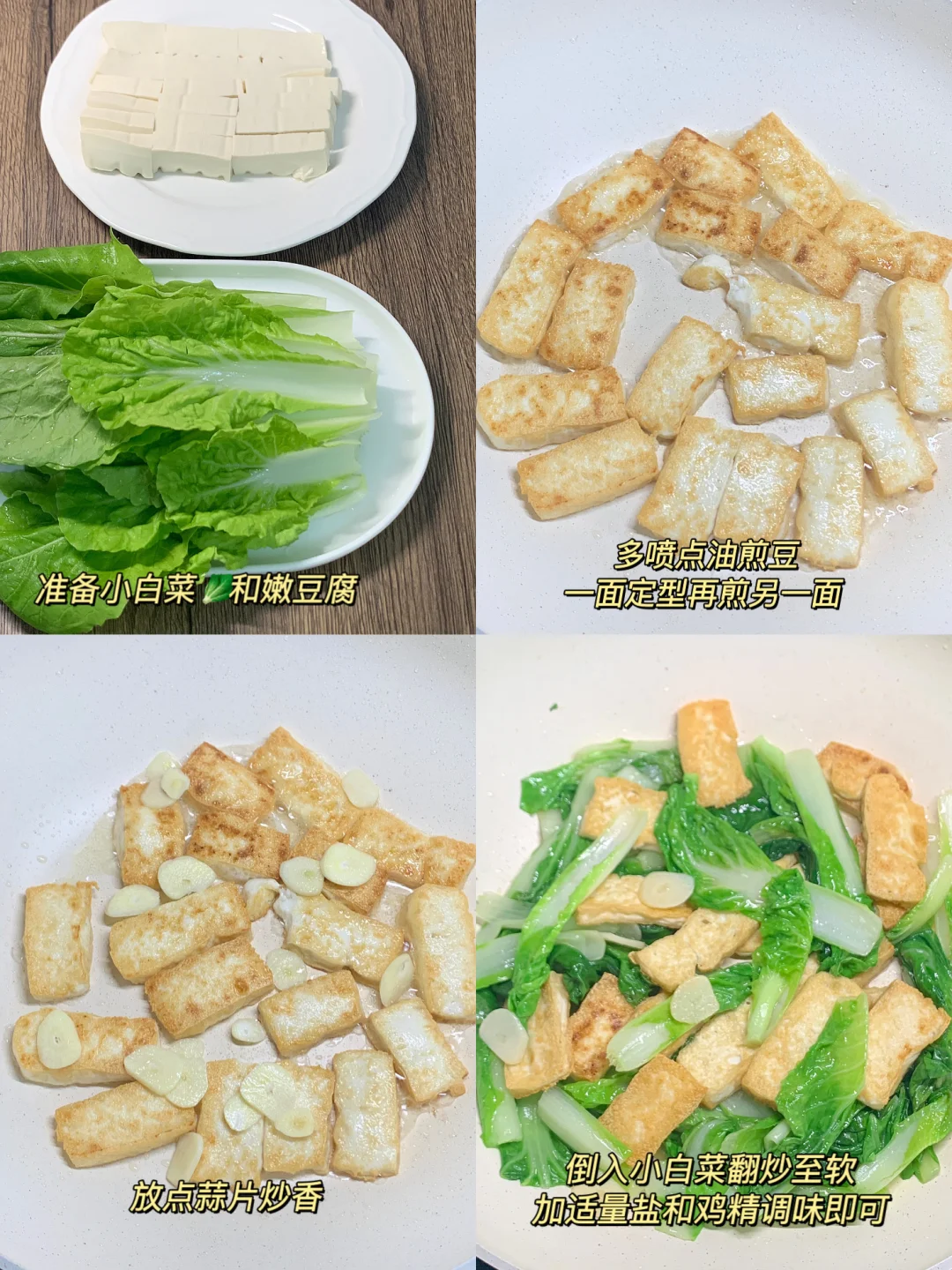 吃的干净真的会瘦! 今日减脂食谱 小白菜煎豆腐🥬,用的是嫩豆 腐,煎起来比较小心一点,清爽的白菜融合了豆腐的焦香,多吃对女性友好,含丰富的植物蛋白,低卡且养脾胃!!