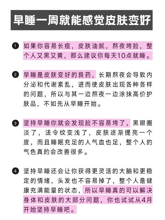 早睡是皮肤变好的良药,长期熬夜会导致内分泌和代谢紊乱,进而使皮肤出现各种各样的问题,所以与其一边熬夜一边涂抹高价护肤品,不如先从早睡开始。