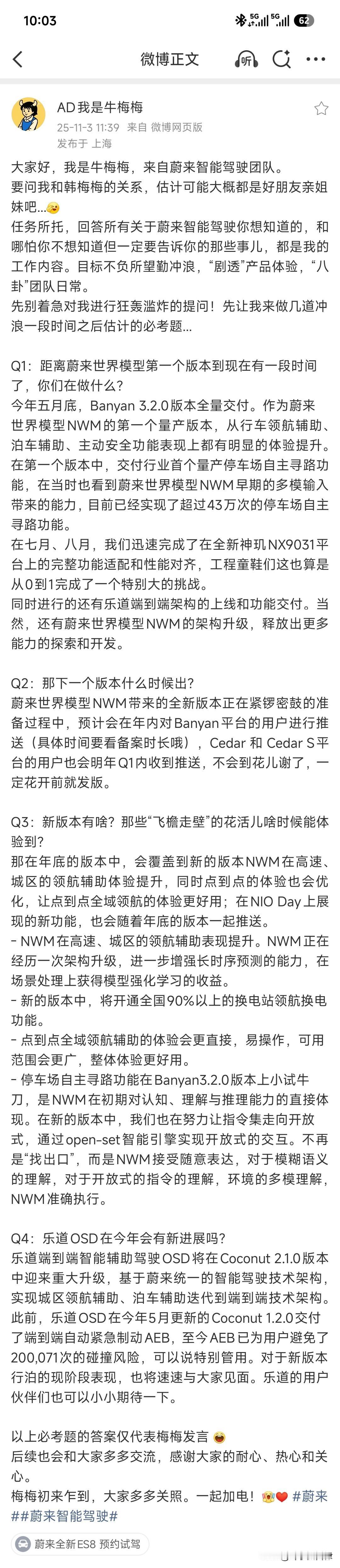 蔚来智能驾驶最新消息:进展神速,未来亮点满满 这个韩梅梅朋友,来自蔚来智能驾驶团队发言人牛梅梅透露诸多NWM的关键信息。 当前进展成果显著,今年5月底交付的Banyan 3.2.0版本,作为蔚来世界模型NWM首个量产版,行车领航辅助、泊车辅助等功能体验大幅提升,停车场自主寻路超43万次。7 - 8月,完成全新神玑NX9031平台适配对齐,还推进乐道端到端架构上线与NWM架构升级。 版本更新计划明确,NWM全新版本预计年内推给Banyan平台用户,Cedar和Cedar S平台用户明年Q1能收到。 新版本功能强大,年底版本将提升多场景领航体验,推送NIO Day新功能;NWM架构升级增强预测能力,开通多数换电站领航换电,停车场寻路指令集开放交互;乐道端到端智能辅助驾驶OSD在Coconut 2.1.0重大升级,此前版本AEB已避免超20万次碰撞风险。