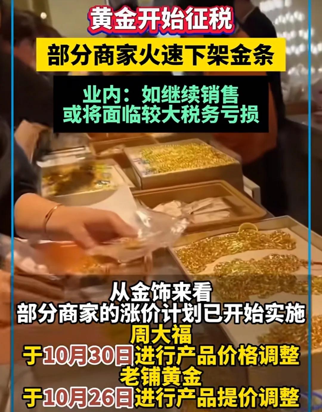 今后买黄金都要交税了?其实不尽然。黄金买卖新规落地后,影响才刚刚开始。新规说白了明确两个方向,一个是将专业黄金交易引导至两大交易所,另一个是将黄金投资需求引导至银行积存金、纸黄金和股市黄金ETF等渠道。这两大个人投资黄金的渠道免税,其余涉及实物交割或黄金流通的渠道,都需要交税。上面这么做的目的,一个是降低黄金场外交易量,减少黄金实物囤积。一个则是推动黄金交易集中到两大交易所,全面掌握黄金交易和流通情况的同时,提高我们对国际金价的话语权。 新规刚落地一天,几大国行相继叫停了黄金积存金业务,主要是国际金价近期波动太大,一时涌进大批人,很多并不具备相应风险承受能力,其中相当一部分都是银行储户。近期国际金价短期从4400跌至3900美元,如果不进行限制,金价如此剧烈波动下,很多人会面临巨额损失,为了避免前几年的“中行原油宝”悲剧再次上演,银行暂时关闭这个渠道很正常。 黄金首饰厂商可能是这轮新规最直接的受害者,因为需要直接购买实物黄金加工后销售,意味着金饰商需要承担6%的增值税,总体成本将增加10%-15%,这让日子本就艰难的金饰商更加雪上加霜。金饰巨头周大生一年关了300多家门店,其余也不好过。因为处于行业最下游,黄金疯涨之下,金饰品的价格跟着暴涨,金饰品作为消费品又缺乏投资属性,买金的人自然锐减。同样敏感深圳水贝黄金市场上,可能会出现越来越多金料商爆雷,这点需要高度注意。 不过对于普通人来说影响不大,除了执着于实物黄金的人外,大家买黄金ETF或是去银行买纸黄金、积存金的,成本依然不变。