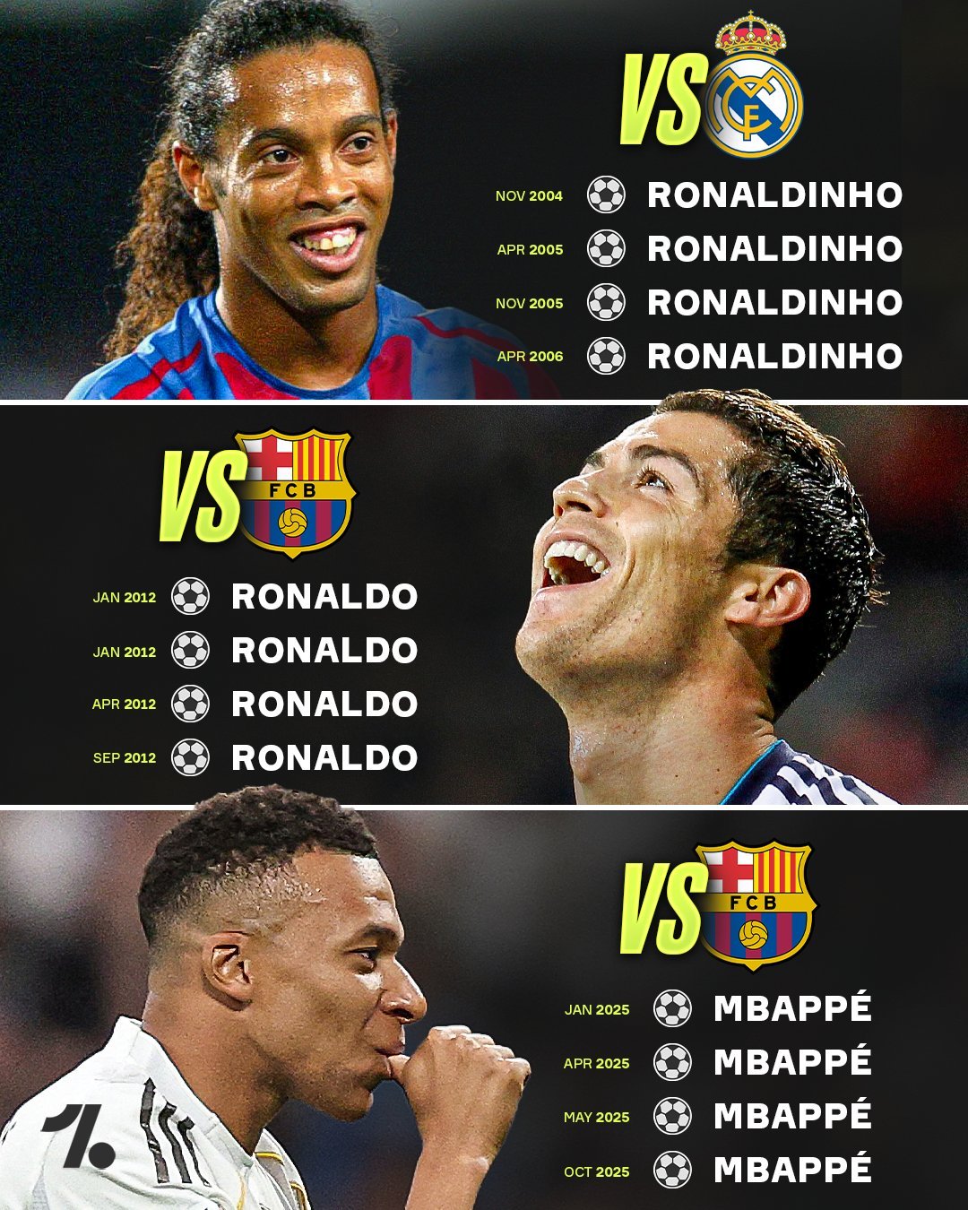 🔺OneFootball说只有小罗、C罗、姆巴佩三人做到连续四场国家德比取得进球是错的!