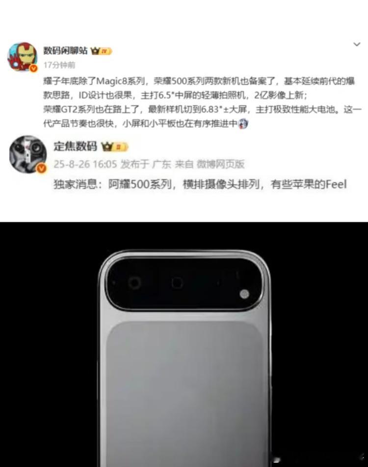 据爆料荣耀500系列采用横向摄像头排列,听说年底发布,如果真是这样那500系列的变化还是有点大的[并不简单]