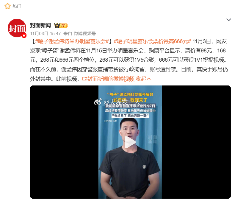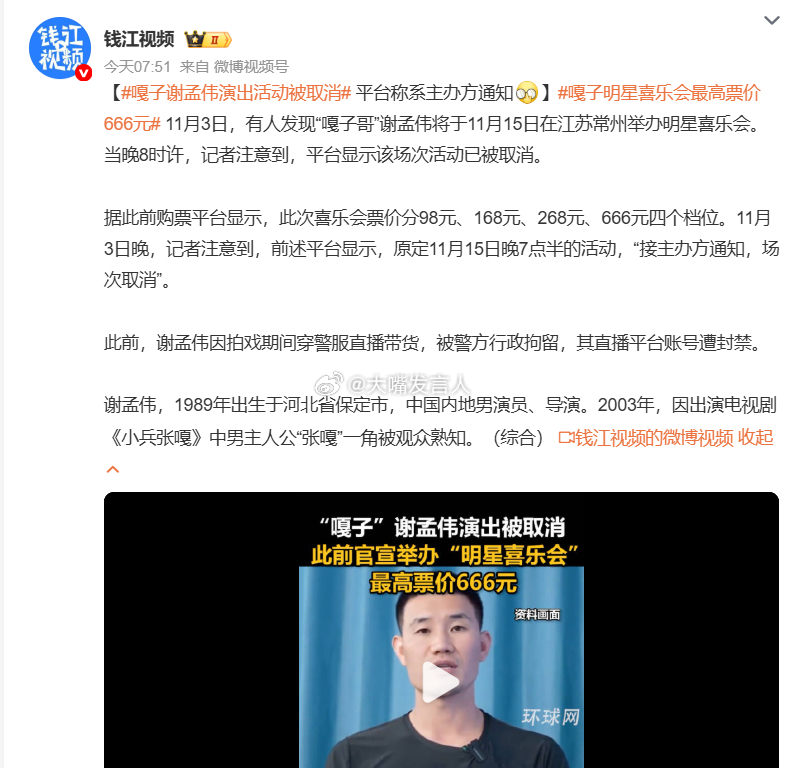 嘎子谢孟伟演出活动被取消 遗憾呀,昨天看到嘎子谢孟伟将举办明星喜乐会,我还是很期待的,准备看戏看热闹,看看哪些艺术人员尤其是老艺术家们,会去给嘎子为艺术而现眼,不是,是献演献唱[允悲][允悲]