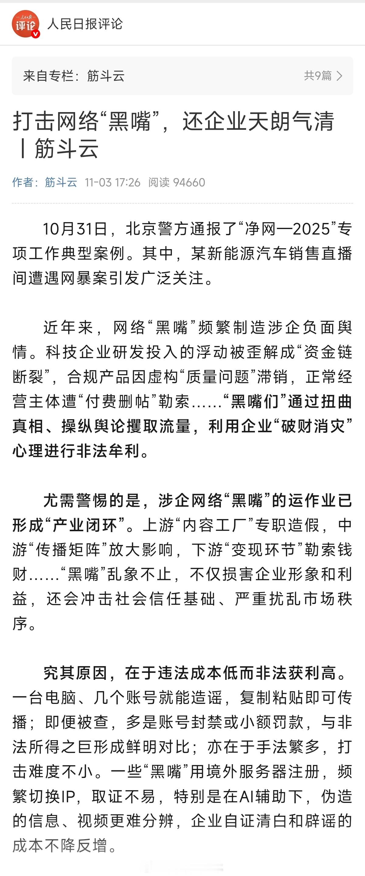 现在连人民日报评论都发声了,开头就引用小米汽车被黑的案例,看来是真的看不下去了。