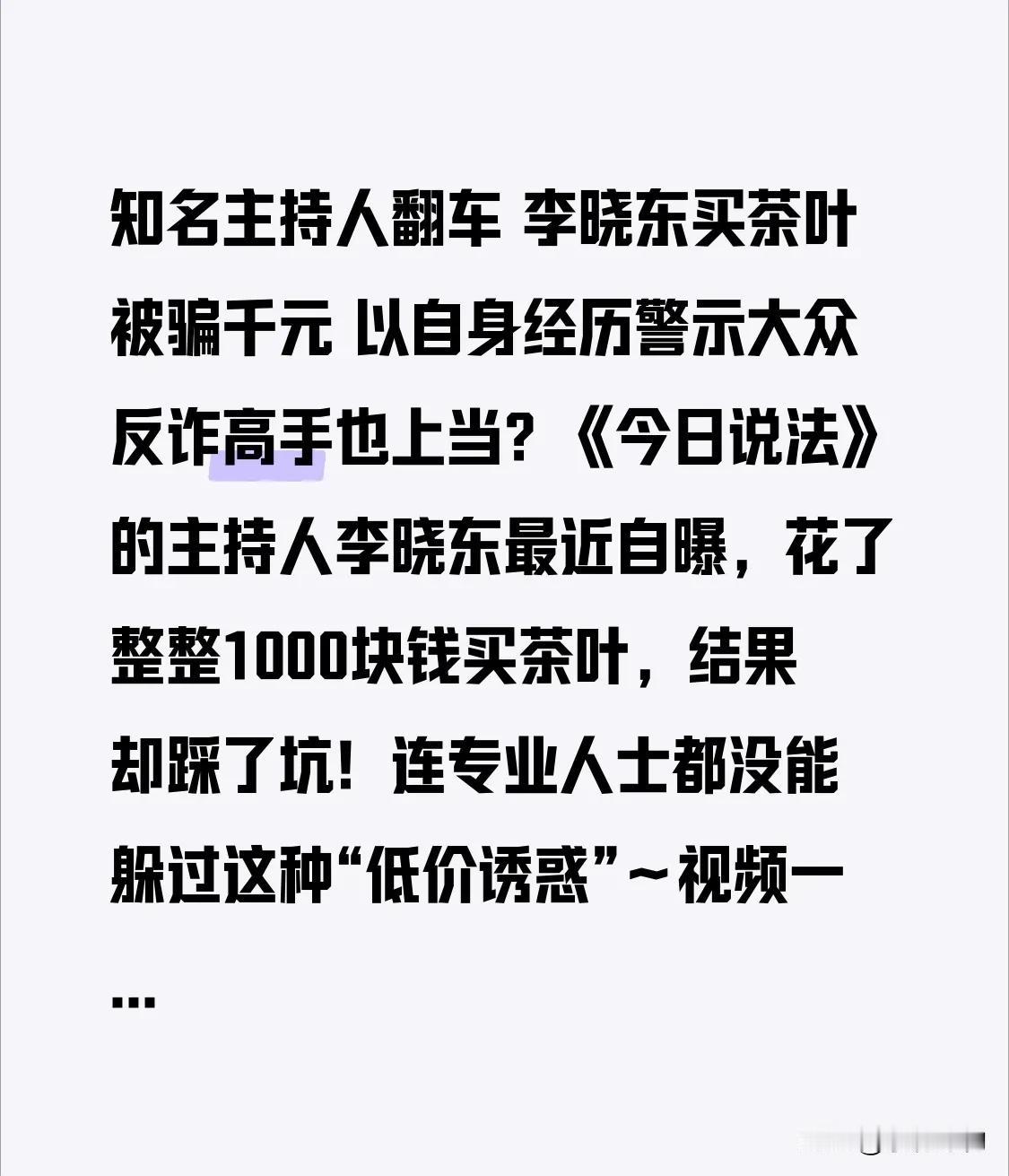 知名主持人翻车 李晓东买茶叶被骗千元 以自身经历警示大众 反诈高手也上当?《今日说法》的主持人李晓东最近自曝,花了整整1000块钱买茶叶,结果却踩了坑!连专业人士都没能躲过这种“低价诱惑”~ 视频一出来就火了,播放量直接冲到58万次。网友们一边开玩笑说“反诈达人自己成了典型案例”,一边忍不住感慨骗术真是防不胜防——原来再懂行的人,一贪小便宜也可能翻车。 说实话,李晓东愿意主动分享这次经历真的挺有勇气!他把自己的尴尬事变成了给大家上的一堂防骗课,提醒我们:骗子最会利用人的心理弱点,遇到那种“好事送上门”的时候,记得多问自己一句“这么好的事为啥偏落我头上?” 现在连反诈专家都得交“学费”,咱们普通人更得小心再小心!你们有没有类似的被骗经历?快来评论区聊聊你的防骗经验,帮大家一起管好自己的钱包吧~ 茶叶直播陷阱 茶友被骗 照骗茶 茶叶欺诈