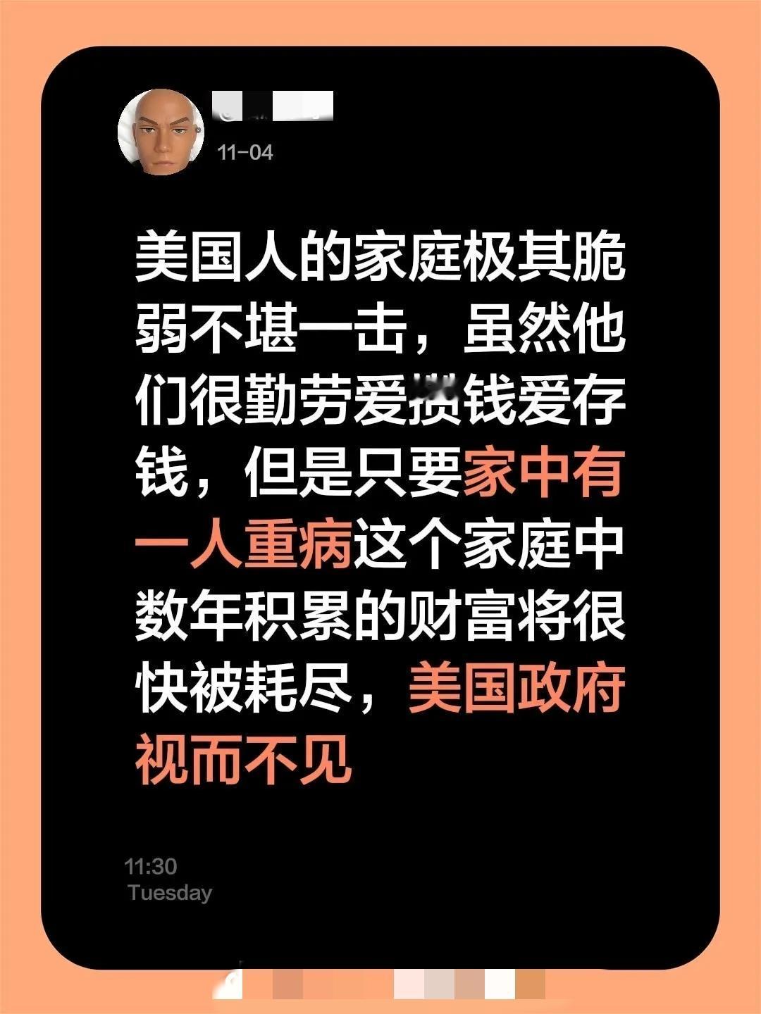 美国人的家庭极其脆弱不堪一击,虽然他们很勤劳爱攒钱爱存钱,但是只要家中有一人重病,这个家庭中数年积累的财富将很快被耗尽,但美国政府视而不见。 第一,美国人从来不爱攒钱,他们喜欢超前消费,喜欢贷款消费,他们喜欢享受当下。 第二,他们小病靠扛,医生给他们开的是止疼药,拍个CT后还是开止疼药。 第三,他们大病靠命,有钱治疗,没钱等死。有钱治的,家被拖垮,成了流浪汉,没钱治的,还勉强有个家。 第四,美国遍地流浪汉、老毒鬼,美国政府视而不见,偶尔给发点救济粮,而不是帮助他们从根本上致富。 总之,资本主义国家里医疗是中产阶级及其以上的专利品,美国政府视而不见的东西太多。 再看这个评论,真是含沙射影、罔顾事实!我们中国有城乡居民医疗保险、农村居民医疗保险、养老保险,有脱贫攻坚,更重要的是我们都是热心的中国人,一人重病八方捐款,绝不会让你因病成为流浪汉。