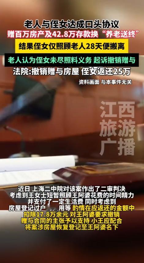 上海,一位80岁孤苦无依的阿婆,和侄女协商,若侄女为她养老送终,她就赠予侄女一套房子和42万存款。谁承想,最后阿婆不仅惹了一肚子气,还折损了钱财。 据江西旅游广播10月31日报道,王大妈的老伴儿走了以后,一个人住在空荡荡的房子里,日子过得那叫一个孤单。 都说人老了怕摔,王大妈就结结实实地摔过一次,躺在地上动弹不得,叫天天不应,叫地地不灵,硬是熬了三天才摸到手机打了求救电话。 就是这次经历,让她彻底怕了,她意识到,自己需要一个人在身边照顾着,不然哪天真出了事,可能就这么无声无息地走了。 王大妈不是没想过请保姆,可她打听了一圈,住家保姆一个月开口就要七八千,她手里那40多万存款,掰着指头算算,连五年都撑不下去。 更何况,保姆毕竟是外人,能不能真心待她,会不会惦记她剩下的这点家当,这都是未知数,思来想去,她把希望寄托在了亲戚身上,想到了那个在清明节见过一面的侄女王女士。 侄女当时那句“以后有难处就找我”,成了王大妈心里的一根救命稻草,于是,王大妈就把侄女请到家里,把自己的家底——房产证和存折都摊在了桌上,说出了那个沉重的托付:只要你给我养老送终,这些就全是你的。 这个提议,对于任何人来说,都是一个巨大的诱惑,一套上海的房子,加上几十万现金,这可不是一笔小数目。 侄女王女士当场就答应了,话说得特别好听,拍着胸脯保证一定把姑妈伺候得妥妥帖帖,王大妈也是个实在人,看侄女答应得这么爽快,就立马开始兑现自己的承诺。 她先是跟着侄女去银行,把账上所有的钱,一分不留地转给了侄女,然后,又马不停蹄地去房产中心,把自己住了大半辈子的房子,过户到了侄女儿子,也就是她侄孙的名下。 办完手续那天,看着存折上归零的数字,王大妈心里五味杂陈,既有对未来的期待,也有一种把身家性命都交出去的不安,但她选择了相信亲情。 可惜,现实很快就给了她一记响亮的耳光,侄女搬进来之后,一开始那几天确实还像那么回事,家里热闹了,一日三餐也有人做了。 但好景不长,矛盾很快就出现了,王大妈觉得侄女做的菜太咸,说了几次对方也不改,晚上起夜想喝口水,喊半天侄女才不耐烦地从沙发上起来。 最让她寒心的是,有一次她感冒发烧,浑身难受,侄女就扔给她一盒退烧药,自己扭头就出去跟朋友吃饭了,玩到半夜才回家。 这下王大妈彻底心凉了,她想不通,自己把房子和钱都给了你们,难道就换来这样的照顾?她忍不住跟侄女吵了起来。 可侄女那边也觉得委屈,觉得自己每天做饭洗衣,已经尽力了,是姑妈太难伺候,饭硬了不行,软了也不行,简直没法弄。 就这么吵了几次,亲情那点本就脆弱的联系,在日常的琐碎和摩擦中被消耗得一干二净,终于,在住进来的第28天早上,侄女收拾东西走了,留下一句“这活我干不了”,把一个烂摊子扔给了王大妈。 空荡荡的房子,还是那个房子,但房本上已经不是自己的名字了,银行卡里,也早就空了,王大妈越想越气,自己掏心掏肺,换来的却是这样一个结果。 她不甘心,最后决定拿起法律武器,把侄女和侄孙告上了法庭,要求他们还钱还房,法庭上,侄女和她儿子的说法,更是让人听了火大。 他们辩解说,自己已经尽力照顾了,是王大妈自己太挑剔,侄孙小王甚至说,当初约定的只是给老人“办后事、扫扫墓”,根本没想到还要贴身照顾生活起居。 这话一说出来,别说王大妈了,估计连法官都听不下去了,几百万的财产,就换来死后扫个墓?这天底下哪有这么便宜的事,这明显就是权利和义务严重不对等。 一些网友评论说得特别直接:“这不就是图人家的钱和房子吗?目的达到了,照顾老人嫌麻烦,就找借口跑了,吃相太难看。” 还有人说:“28天赚17万,这钱也太好挣了,简直是无本万利。” 这些评论虽然尖锐,但也道出了很多人最直观的感受,这起事件,就像一面镜子,照出了人性中贪婪的一面。 侄女一家在巨大的利益面前,显然是动了歪心思,他们可能一开始就没打算认真履行“养老送终”这个沉重的承诺,而是抱着一种“先拿到手再说”的投机心理。 最终,法院的判决还是维护了正义,法院认为,王大妈赠与巨额财产的行为,是附带了“养老送终”这个条件的,现在条件没完成,赠与自然可以撤销。 所以判决侄孙必须把房子还给王大妈,侄女也要返还大部分存款,不过,法院考虑到侄女在这28天里确实也付出了一些劳力,产生了一些生活开销,就从中扣除了17万元作为补偿。 这个结果,虽然帮王大妈追回了大部分财产,但她依然损失了17万,更重要的是,她那颗被亲情伤透了的心,恐怕很难再愈合了。 这件事也给所有面临同样困境的老人敲响了警钟,想要“以房养老”或者“以产换养”,光靠一句口头承诺是绝对不行的,毕竟,人心隔肚皮,亲情在金钱面前也未必靠得住。 信源:江西旅游广播2025-10-31