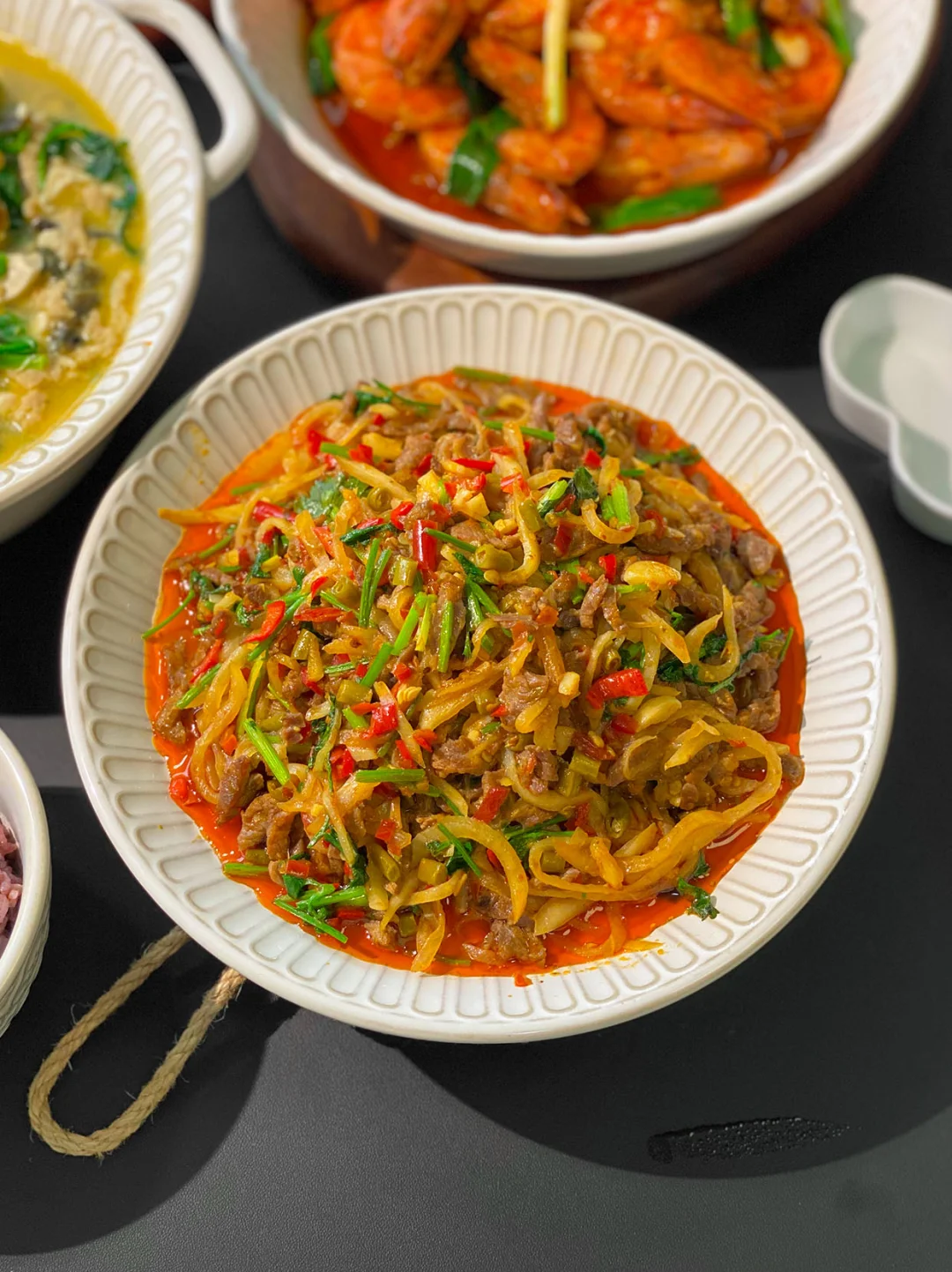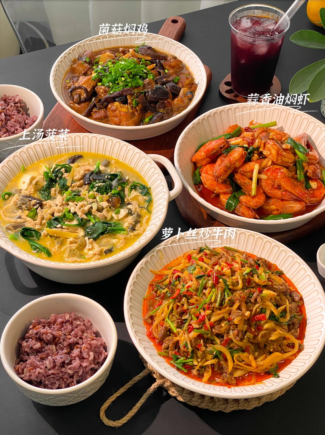 🌈今天的每个菜都爱,菌菇烧鸡炖得软烂入味,蒜香油焖虾煎得壳脆肉嫩,还有超下饭的萝卜丝炒牛肉,光闻着味就期待满满~