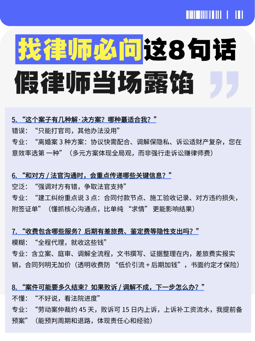 不管刑事、离婚、劳动或经济案件,别被 “有关系”“包赢” 忽悠!这 8 句普适性拷问戳选律师核心,3 分钟试出专业度,律师费不白花! 蕞后救命提醒 律师答得具体、主动问案情,大概率靠谱;只会打包票、回避问题,赶紧换人!选律师拼专业和责任心,比找 “关系” 管用 10 倍!