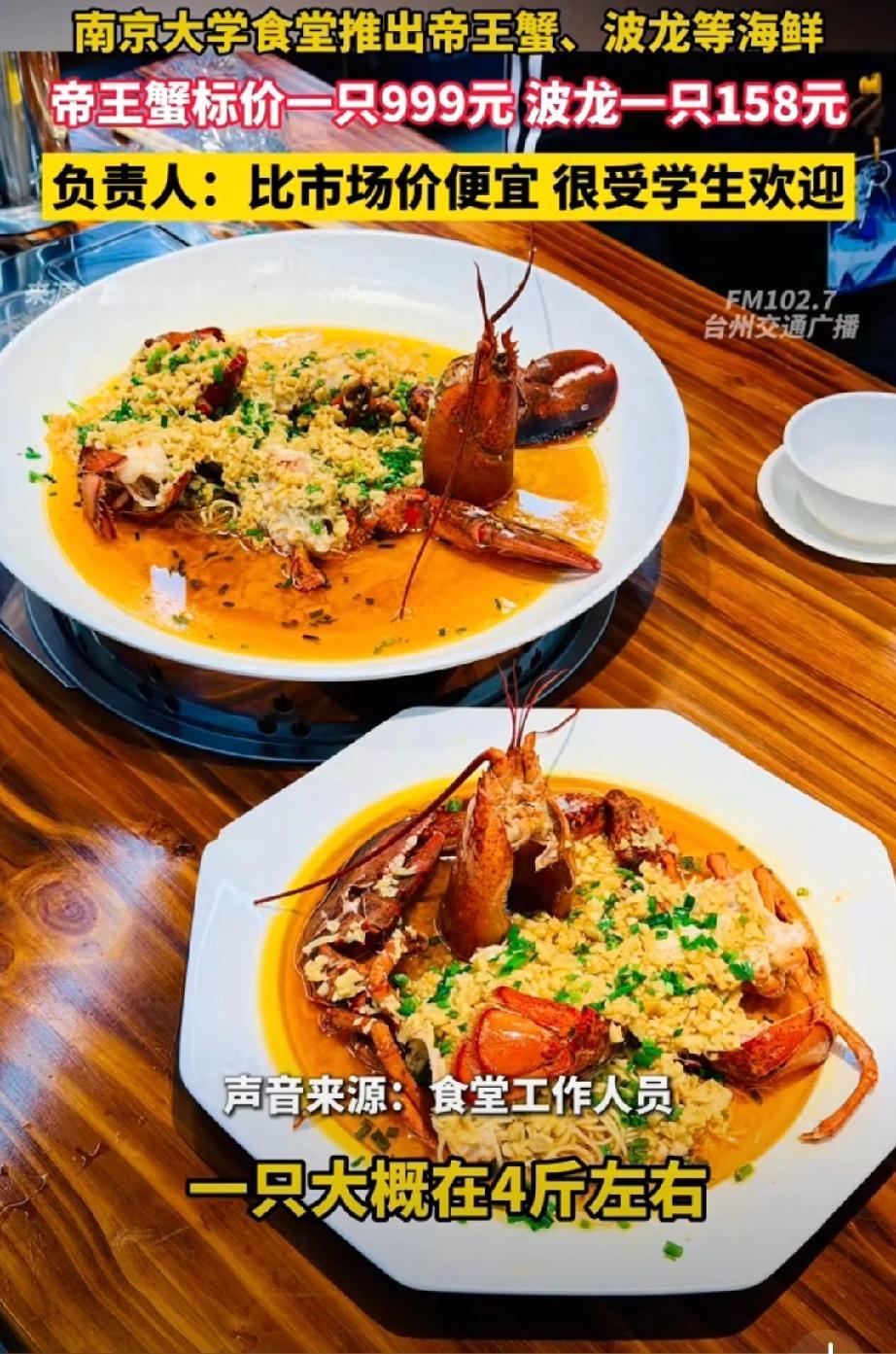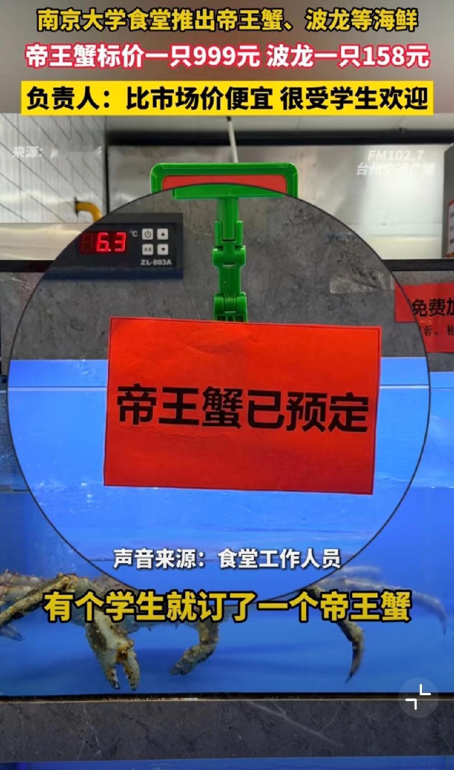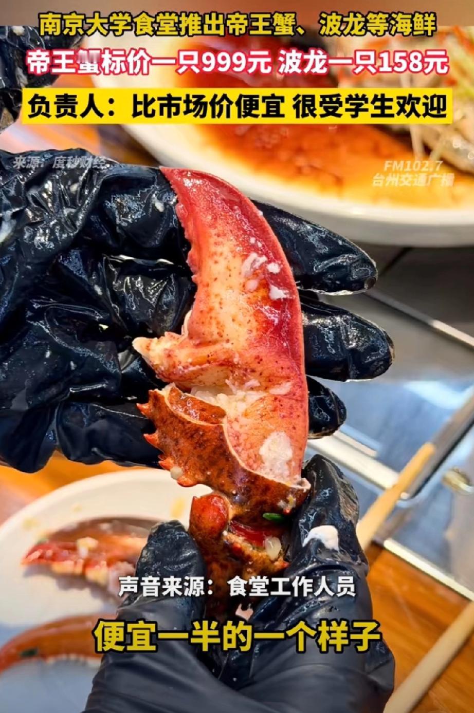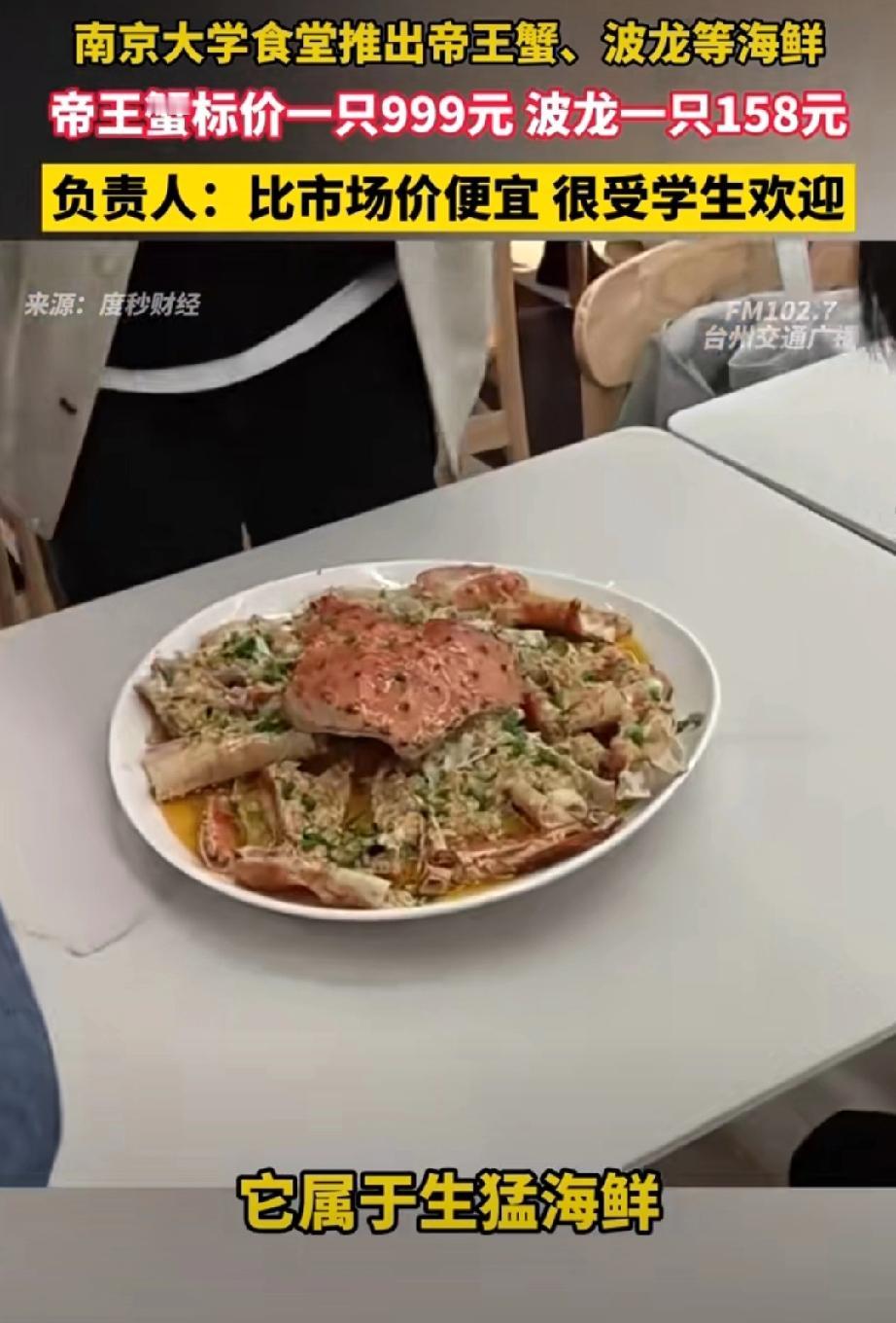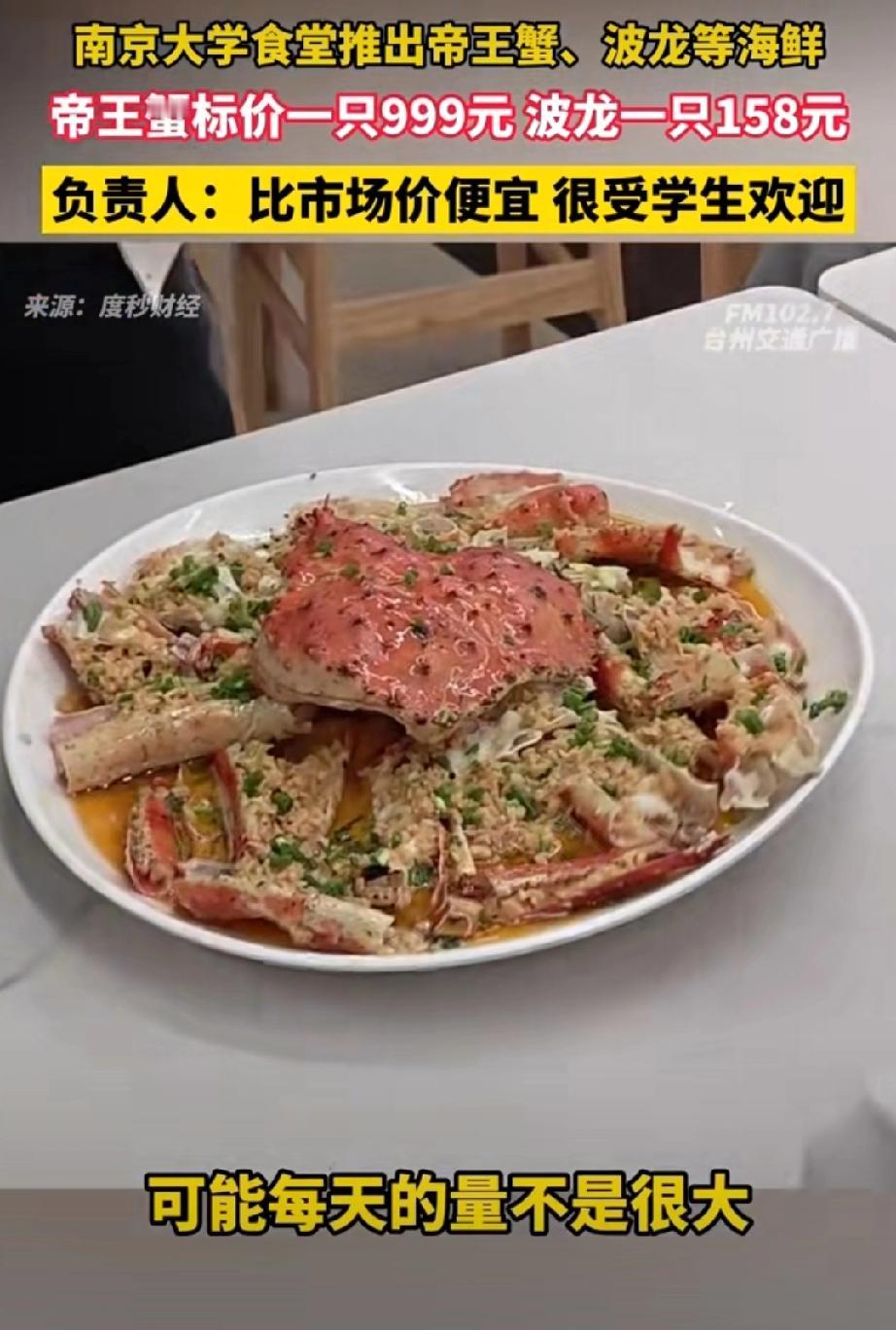 公办高校食堂卖999元帝王蟹,看似是一个你情我愿、买卖自由的交锋,实则是教育资源分配的尴尬。 目前我国大学生月均生活费仅1744元,一只帝王蟹几乎占了半个月生活费,普通孩子肯定消费不起,那卖给谁自然不明而喻。 公办高校食堂是有国家补贴的,作为公共服务场所,其公益属性决定了它应提供平价餐饮,满足大多数学生的基本需求,而非迎合少数富裕学生的高端消费。 这种行为不仅可能引发攀比之风,更与高校倡导的勤俭节约理念相悖。高校食堂的价值,绝非满足小众奢华,而是保障大众公平。 所以,高校食堂与其追求“天价菜”,不如在平价菜的种类、口味、供应效率上下功夫,让每一位学生都能吃得安心、实惠。帝王蟹 大学伙食费 大学食堂物价