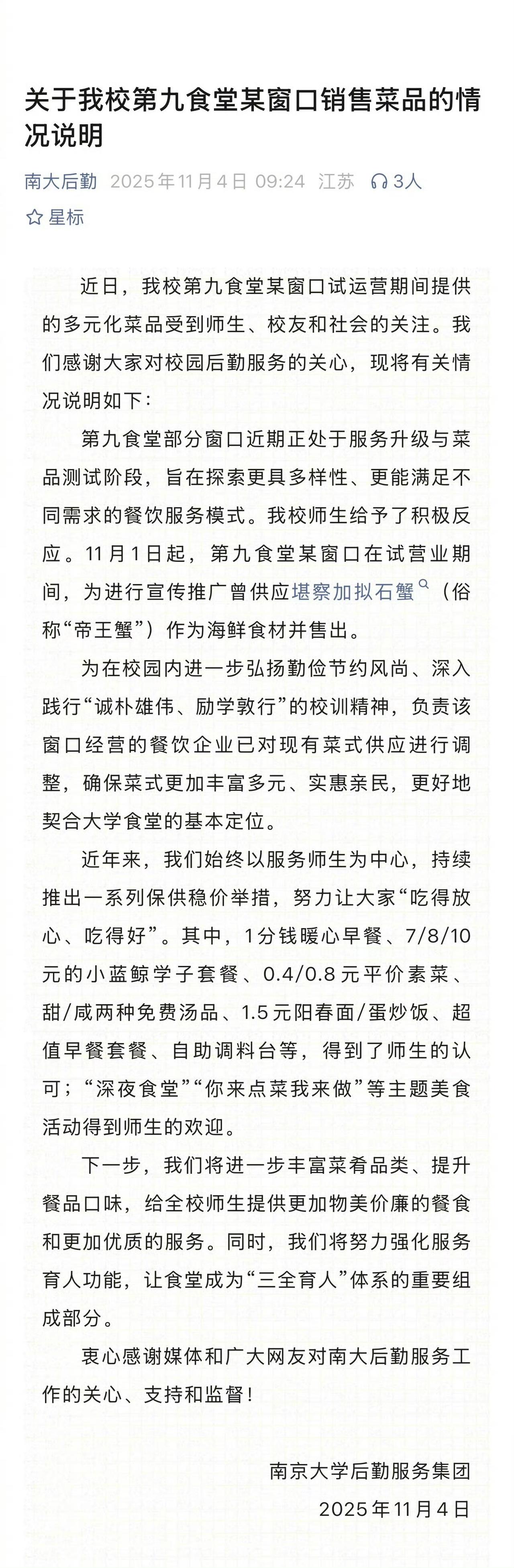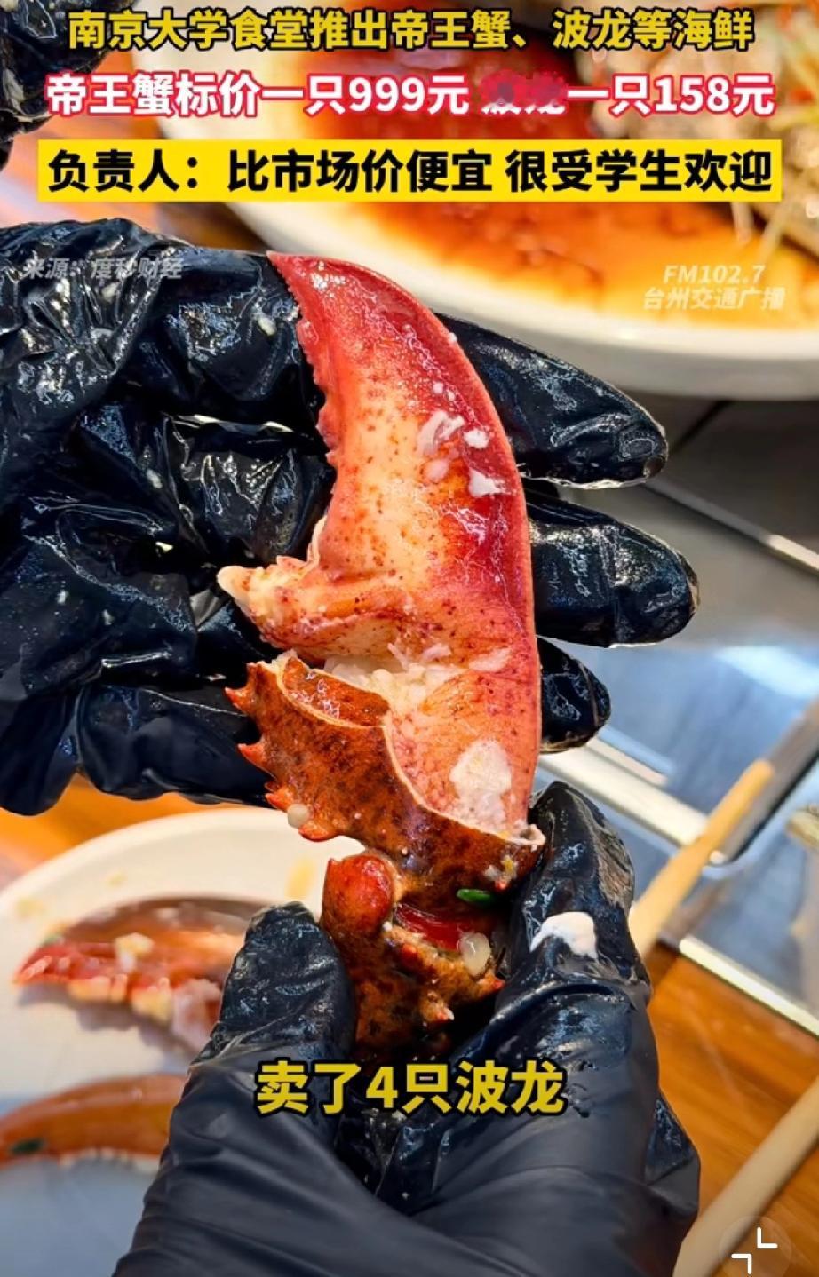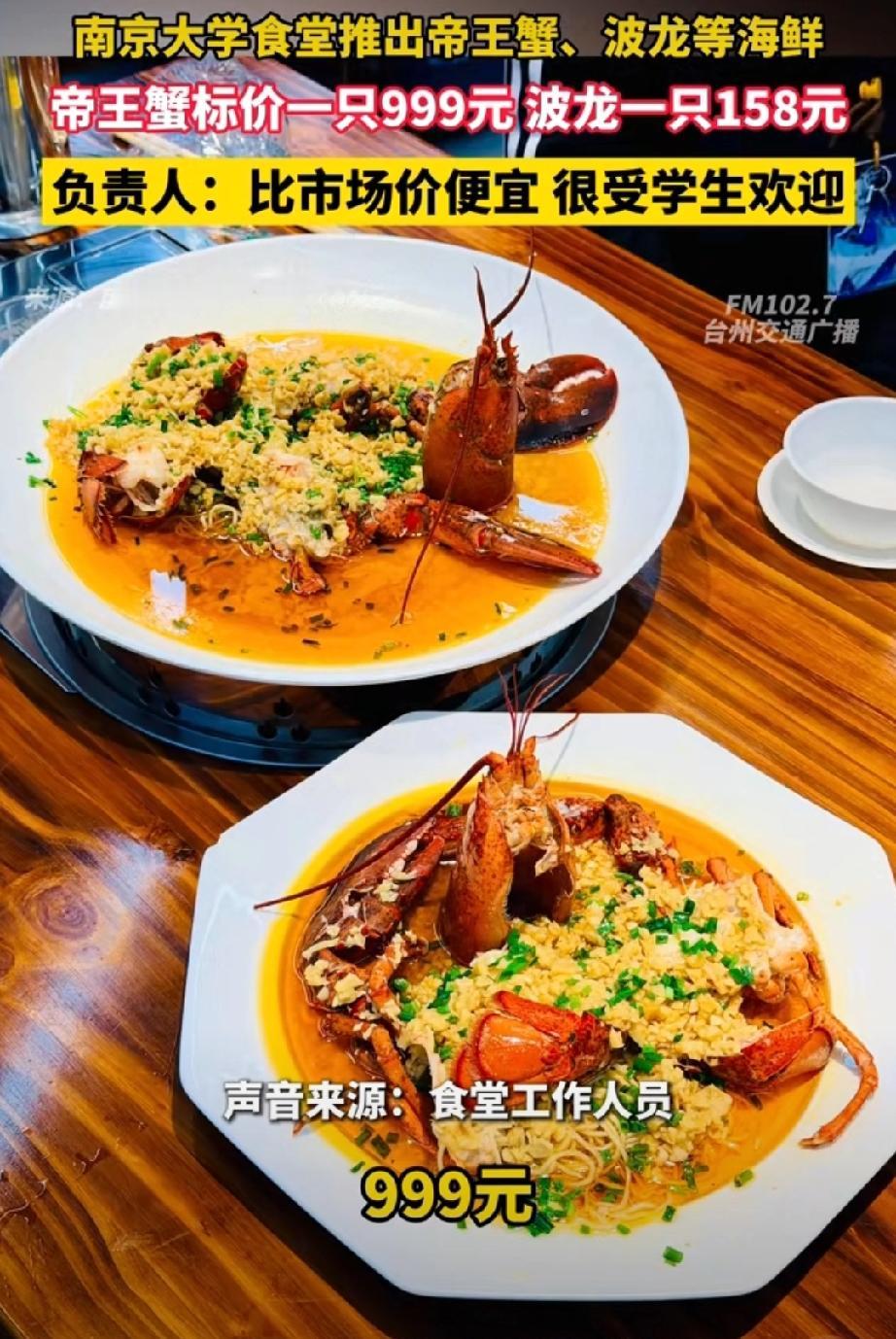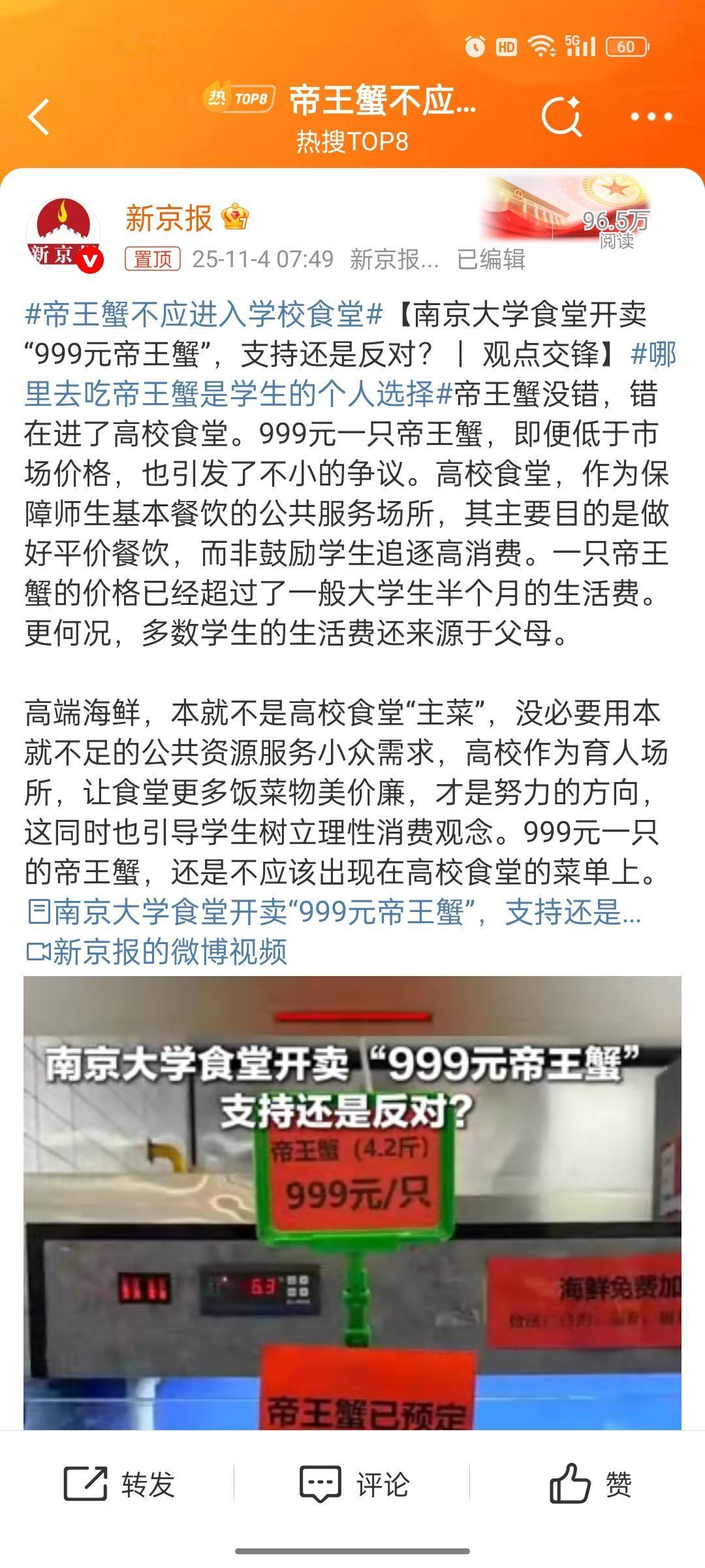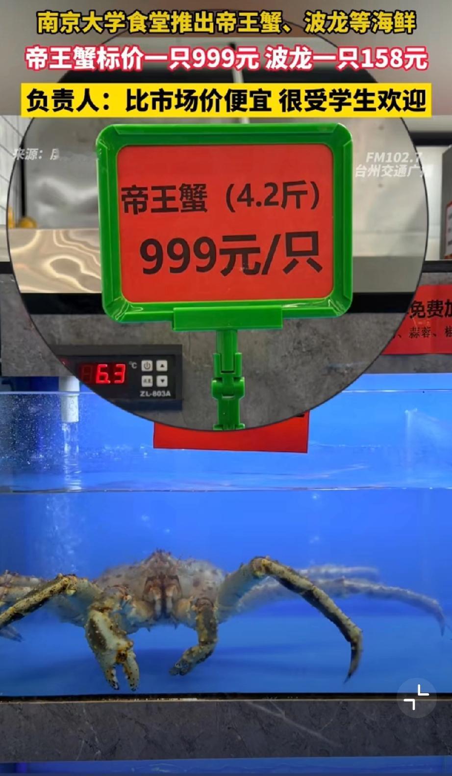 公办高校食堂卖999元帝王蟹,看似是一个你情我愿、买卖自由的交锋,实则是教育资源分配的尴尬。 目前我国大学生月均生活费仅1744元,一只帝王蟹几乎占了半个月生活费,普通孩子肯定消费不起,那卖给谁自然不明而喻。 公办高校食堂是有国家补贴的,作为公共服务场所,其公益属性决定了它应提供平价餐饮,满足大多数学生的基本需求,而非迎合少数富裕学生的高端消费。 这种行为不仅可能引发攀比之风,更与高校倡导的勤俭节约理念相悖。高校食堂的价值,绝非满足小众奢华,而是保障大众公平。 所以,高校食堂与其追求“天价菜”,不如在平价菜的种类、口味、供应效率上下功夫,让每一位学生都能吃得安心、实惠。帝王蟹 大学伙食费 大学食堂物价