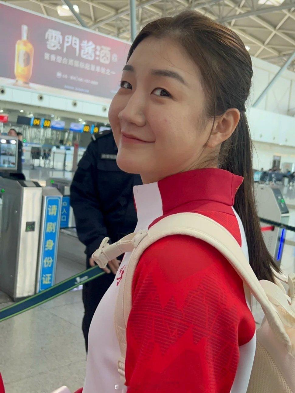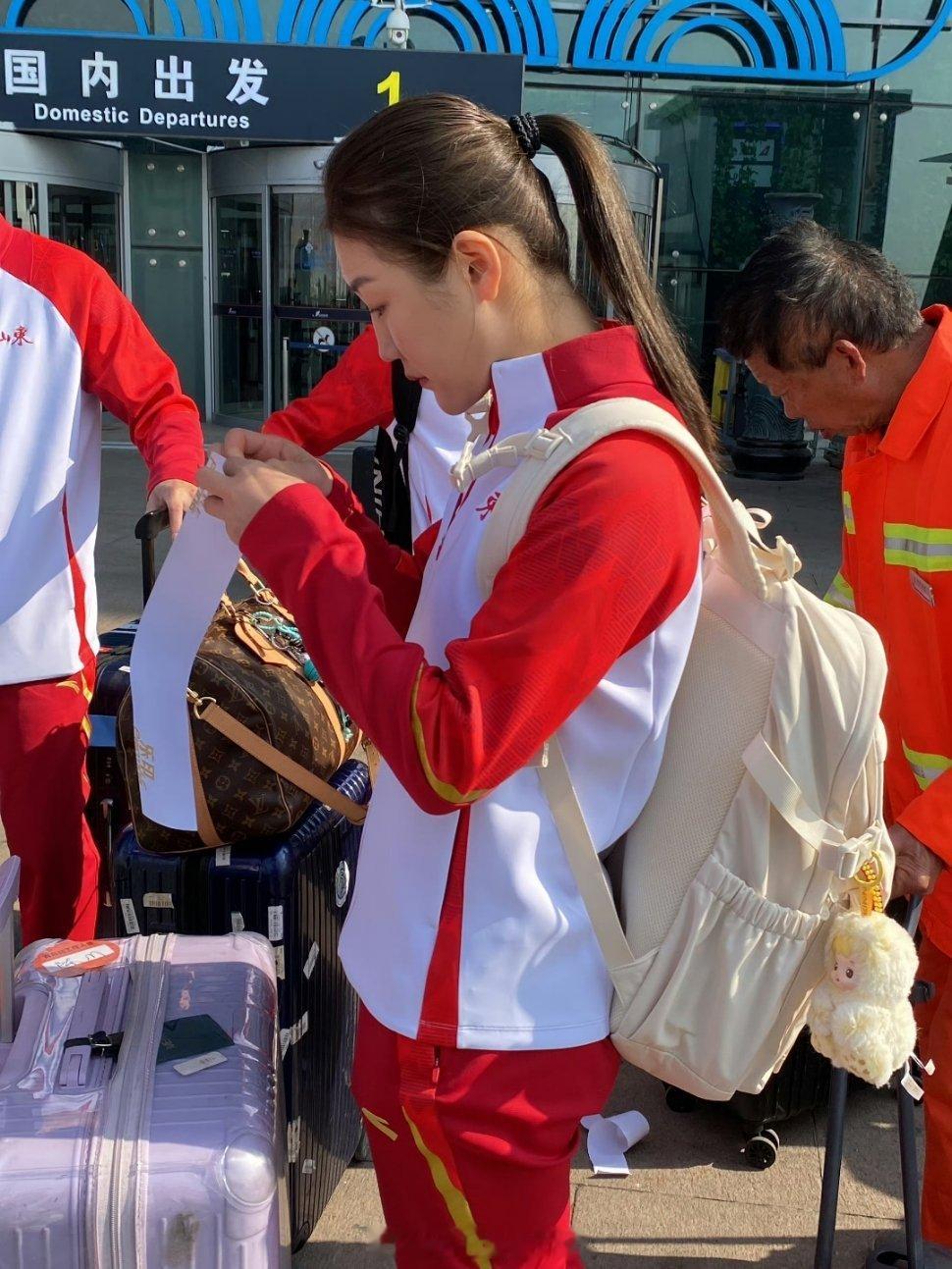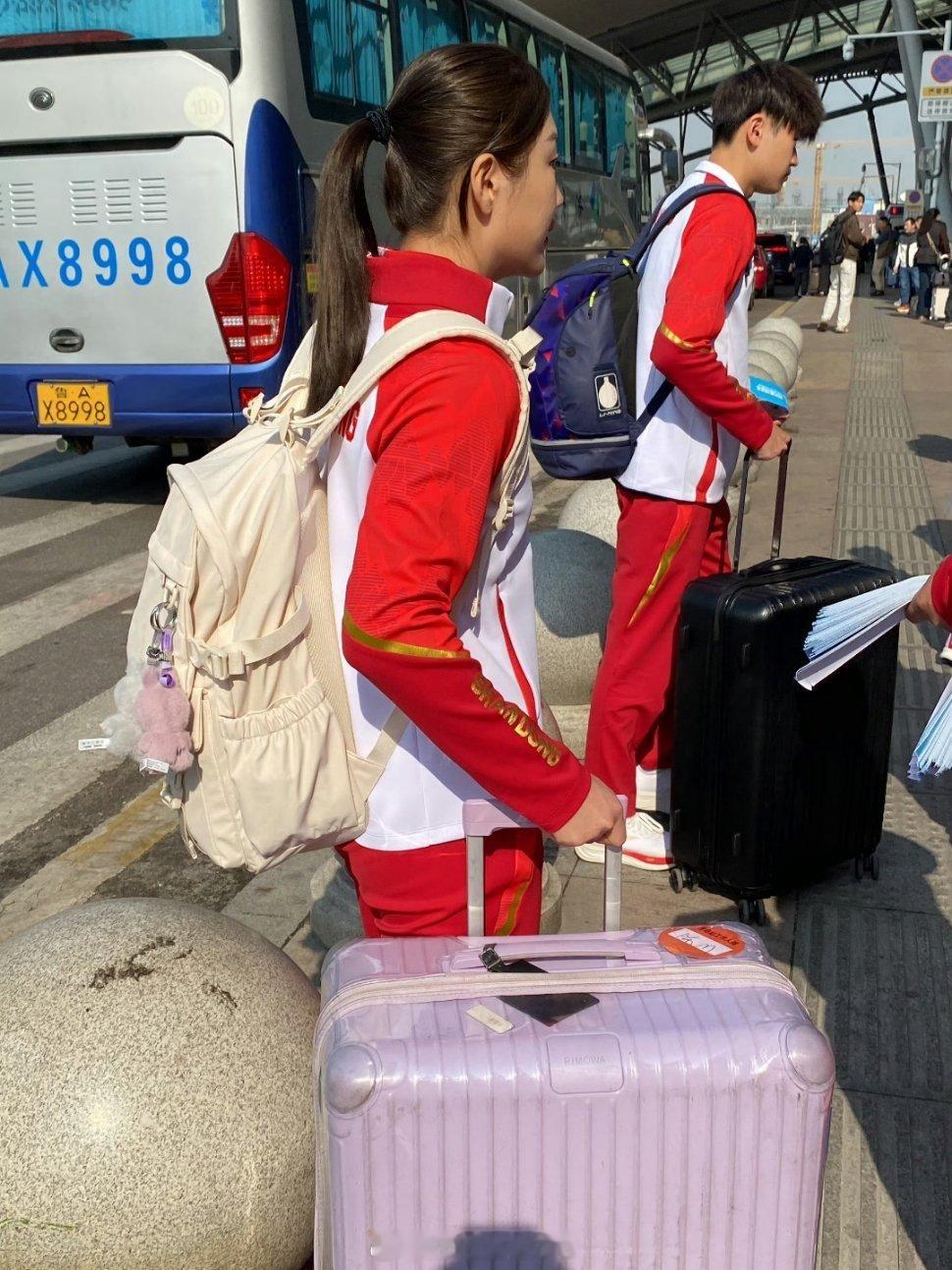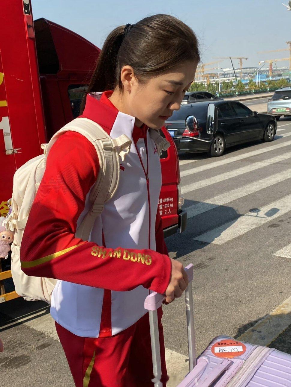 陈梦身着山东省队队服出发前往澳门参加第十五届全运会,她将参加乒乓球项目女单和女团两项比赛。