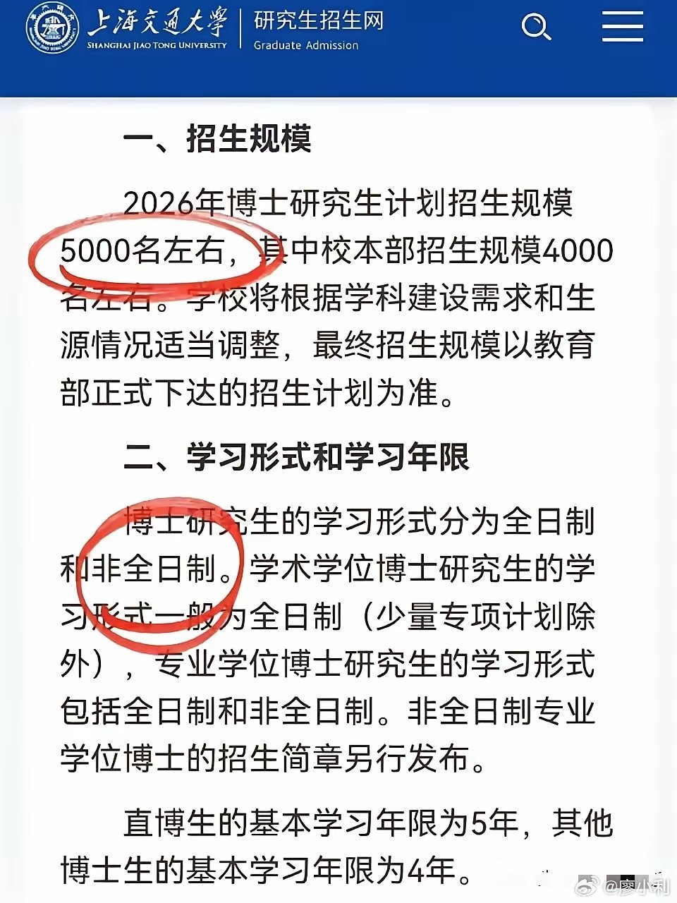 上海交大回应招5000名博士我算了一下,一年招5000名博士生,3年毕业在校博士研究生人数就达到15000人,仅导师就要几千人。有这么多博导吗?该不会把副教授也拉来培养博士?博士数量是上去了,但质量有保障吗?人才培养是有规律的,不能急于求成,不像工业产品可以批量生产。如果单独上交大扩招也就罢了,很可能别的学校出于各种原因可能会效仿,一旦效仿开始,那就会引发新一轮学历军备竞赛!热点观点