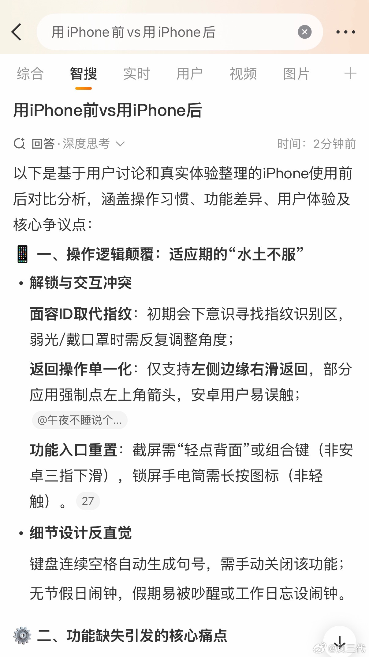 用iPhone前vs用iPhone后其实根本就没有这么夸张,iPhone发展到今天和安卓旗舰也拉不开什么差距了,用起来就挺熟悉挺普通的,和安卓没什么两样[笑cry]