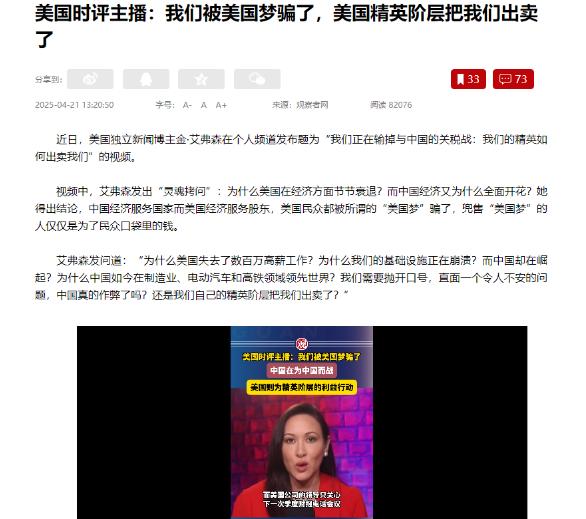 美国民众终于觉醒! 美国一名美女主播一句话捅破窗户纸,她表示:中国在为中国而战,而美国的统治阶层在为自己的利益行动,所以,真正的问题不在于中国在‘作弊’,而在于我们被那些向我们兜售‘美国梦’的人欺骗了!这句话在社交平台疯狂传播,越来越多美国人开始反思,曾经深信不疑的美好愿景背后,藏着怎样的利益算计...... 你以为中美竞争,是两种制度的对决,是文明的冲突?其实没那么复杂。 这位女主播一句话就讲透了:中国是在为中国而战,是整个国家拧成一股绳,为了民族的复兴和老百姓的好日子在拼命。 你看看中国,人家那叫一个目标明确,上下一心,十四个五年计划一步一个脚印,搞高铁,搞芯片,全是为了国家长远的未来在拼。 可美国的统治阶层呢? 他们嘴上喊着“美国梦”,背地里却把工厂一个个搬到海外,为的就是那点廉价的劳动力和利润。他们把工作机会送出去了,把空心化的烂摊子留给了美国老百姓。 他们发动一场又一场战争,肥的是军工复合体的腰包,流的是美国大兵的血。 他们把华尔街搞得天翻地覆,赚得盆满钵满,可中西部铁锈地带的民众,却在为下一顿饭发愁。 所以这位女主播的话才能一下子炸了锅。她说的不是什么高深的理论,而是每个普通美国人都能感受到的痛。为什么曾经繁华的工业城市变成了铁锈地带? 为什么勤劳工作的人却连医药费都付不起?为什么年轻人背负着沉重的学贷,却看不到希望? 过去,政客和媒体会告诉你,这都是因为中国“偷”走了你的工作,因为中国在“作弊”。 但现在,越来越多的人不傻了。他们开始明白,中国只是在玩美国人定下的全球化游戏,并且玩得比他们自己还好。 真正的问题,不在于大洋彼岸的那个对手有多强大,而在于自己家里那些“兜售美国梦”的人,早就把“美国梦”给打包卖掉了。他们欺骗了民众,把国家利益换成了自己的私人飞机和豪华游艇。 这才是最可怕的。当一个国家的精英阶层不再为国家整体利益服务,而是只顾着中饱私囊时,这个国家怎么可能还有凝聚力和战斗力? 所以,美国民众的觉醒,不是突然间对中国产生了什么好感,而是对自己国家的现状感到了彻骨的失望和愤怒。他们终于发现,真正的敌人,可能根本不在国外。