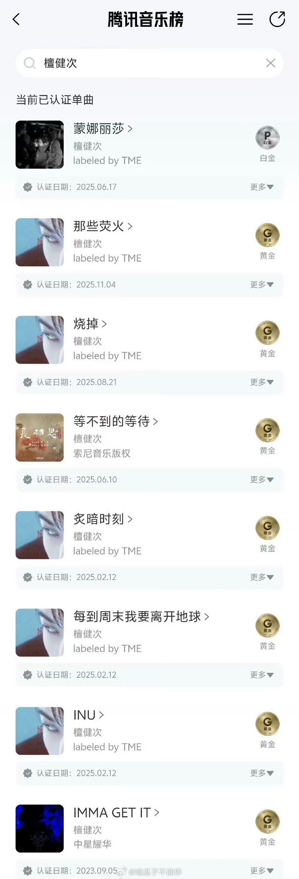 檀健次《那些荧火》获得腾讯音乐榜黄金单曲,目前已经累计7首黄金单曲了👍🏻