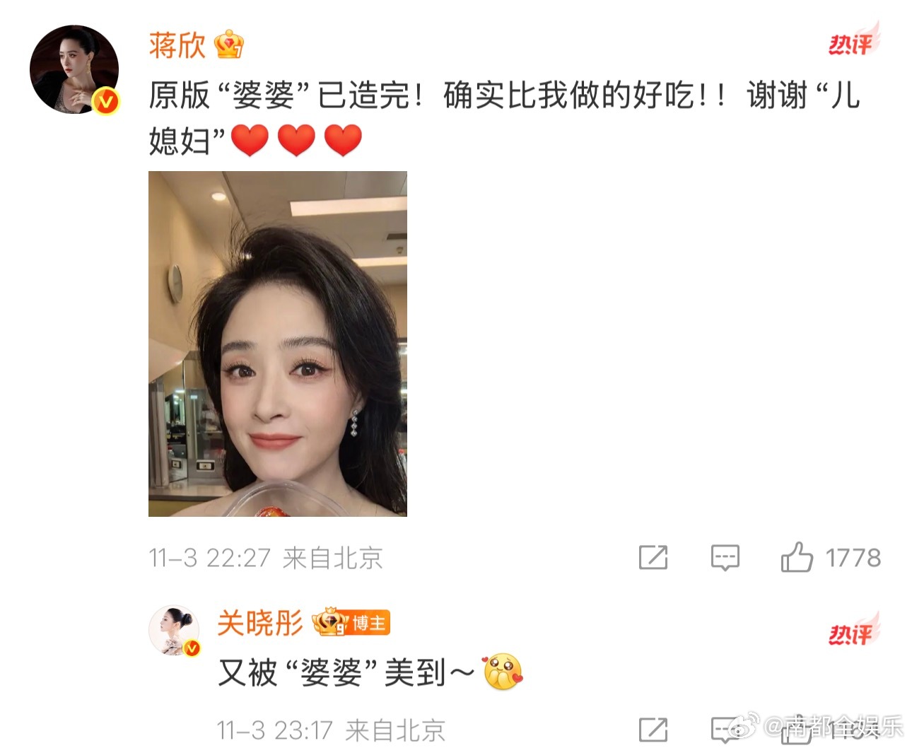蒋欣关晓彤互称婆媳3日晚,关晓彤晒出可可爱爱的下班图,随后蒋欣现身评论区,表示自己吃了关晓彤做的“彩椒碗”,再次自称关晓彤的婆婆,她打趣道:“原版‘婆婆’已造完!确实比我做的好吃!!谢谢‘儿媳妇’[心][心][心] ”关晓彤也回复:“又被“婆婆”美到~[期待]” 好温馨的《小巷人家》售后!林栋哲在哪里?怎么还没来报到[喵喵]!