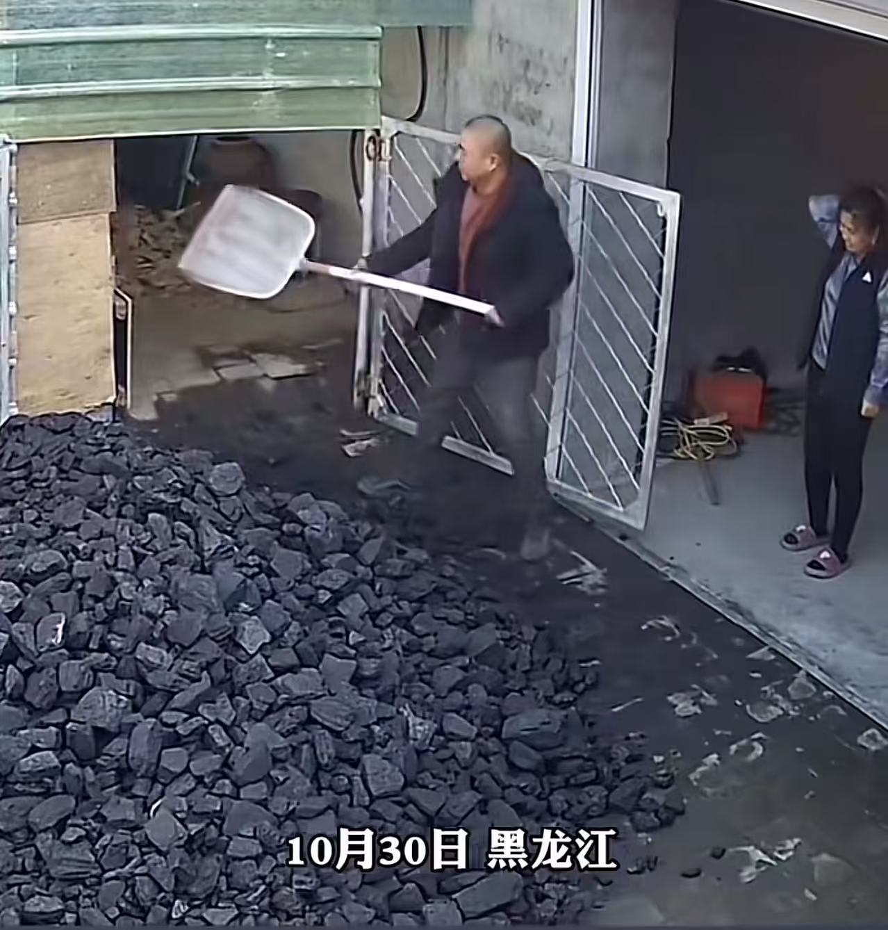 老父亲看着满地的煤,无奈地摇了摇头,随后拿起铁铲,打算把煤一点点铲进仓库里。