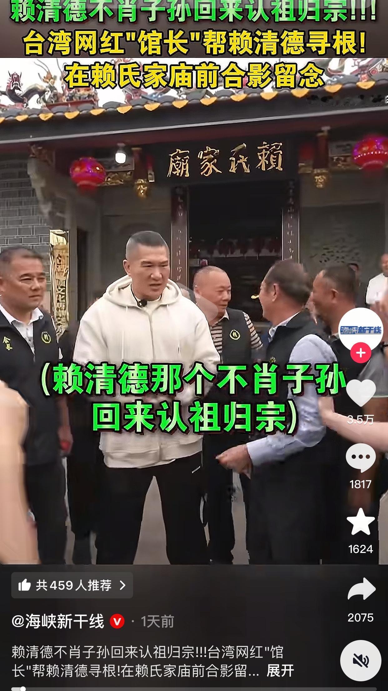 笑不活了 台湾网红馆长来福建游玩意外帮赖清德找到了祖宗 赖家族长抱着赖父辈回来祭祖的照片,在赖家宗祠指着祖训说,不认祖宗不孝之人罪逆天 赖清德这下三天睡不好了,因为他说不是中国人也不是汉人,祖先是长毛象,结果被人找到祖坟了 馆长也呛声,你不是中国人还是长毛象演变的嘛 赖家族人在漳州喊话赖清德认祖归宗 有网友说不认祖国不认祖宗,还不回来谢罪,要不然早点改日本名得了 台湾省网红馆长