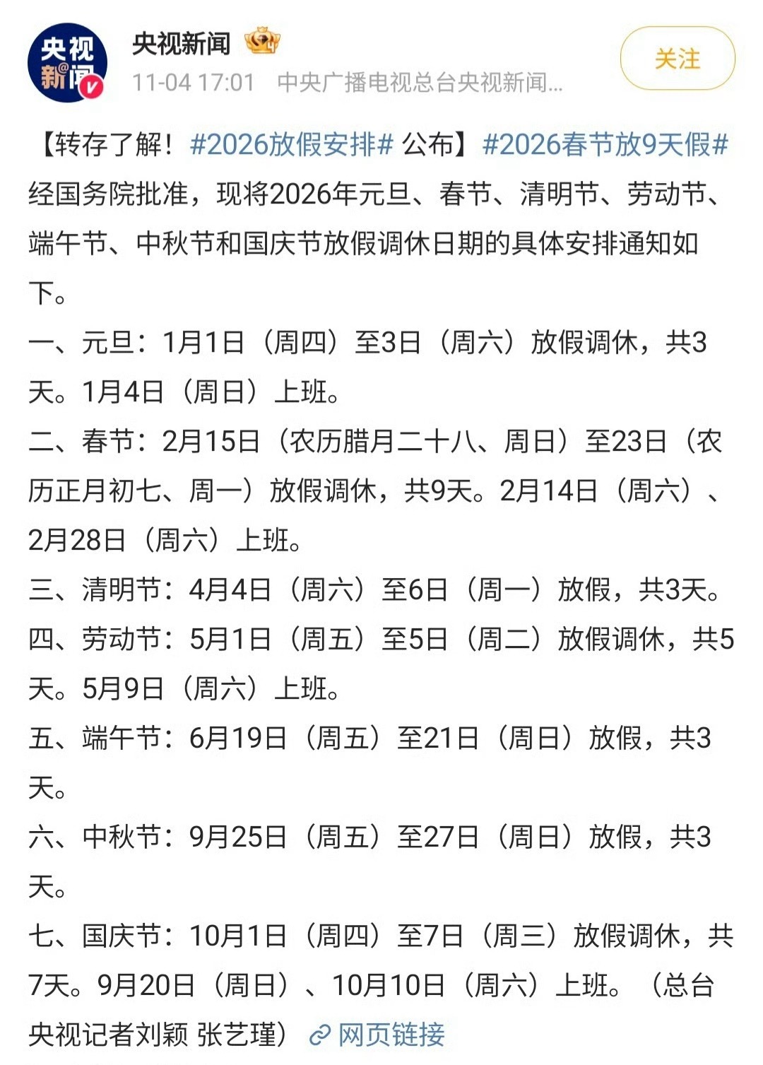 2026春节放9天假,中秋国庆终于分开了,2026一共33天假,各位准备好了吗[送花花]