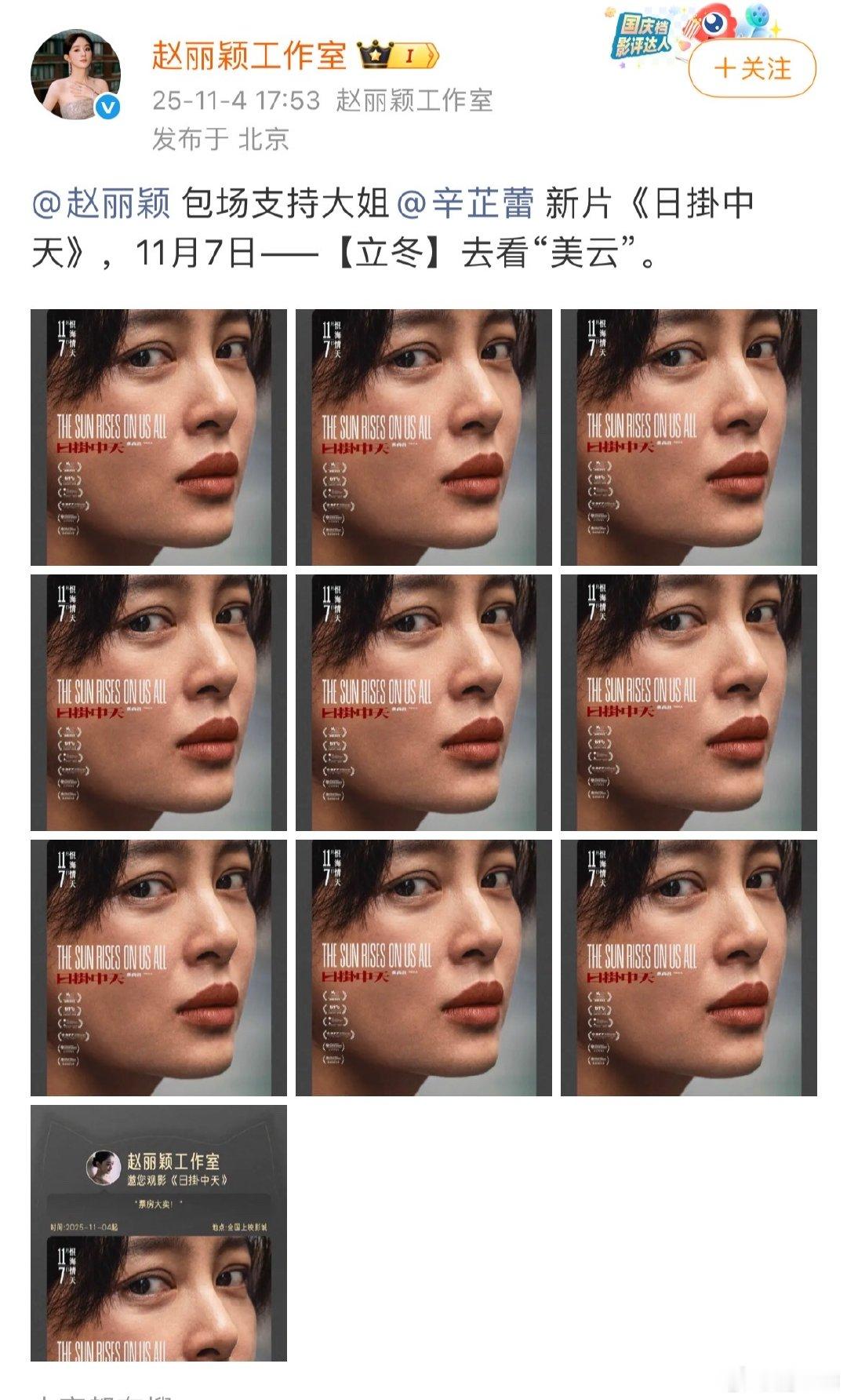 赵丽颖连包10场支持辛芷蕾新电影赵丽颖包十场日掛中天赵丽颖这波操作太暖心了,为辛芷蕾新片《日掛中天》包场,11月7日立冬,去影院看“美云”,感受这份真诚的友谊。