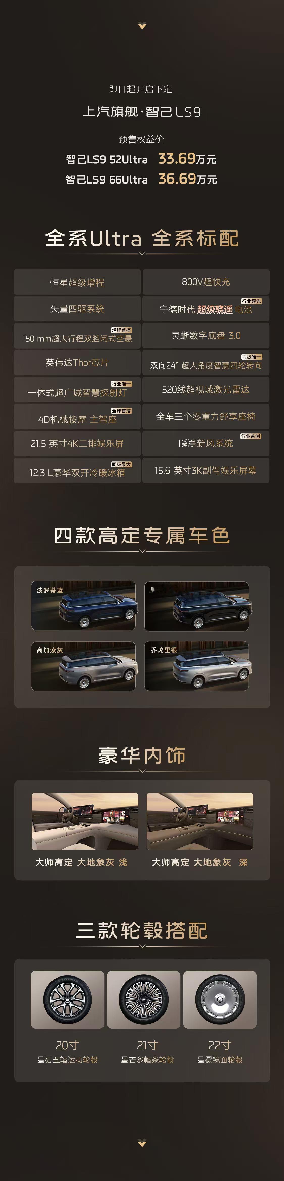 车盟快讯:今晚,上汽集团旗舰新能源SUV智己LS9正式开启预售,预售价区间33.69万-36.69万元,现在下订还可享5000元意向金抵15000元现金抵扣券,总价值58000元配置升级礼等五大购车权益,以及至高15000元购置税差额补贴等的首发承诺,作为上汽集团的年度旗舰SUV,智己LS9搭载恒星超级增程,灵蜥数字底盘3.0,首发B&O音响等的诸多行业黑科技,这么一款旗舰大六座SUV,大家对于智己LS9的预售价还满意吗?
