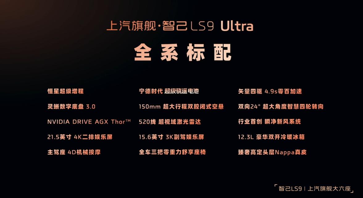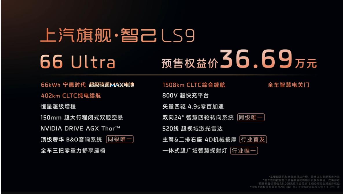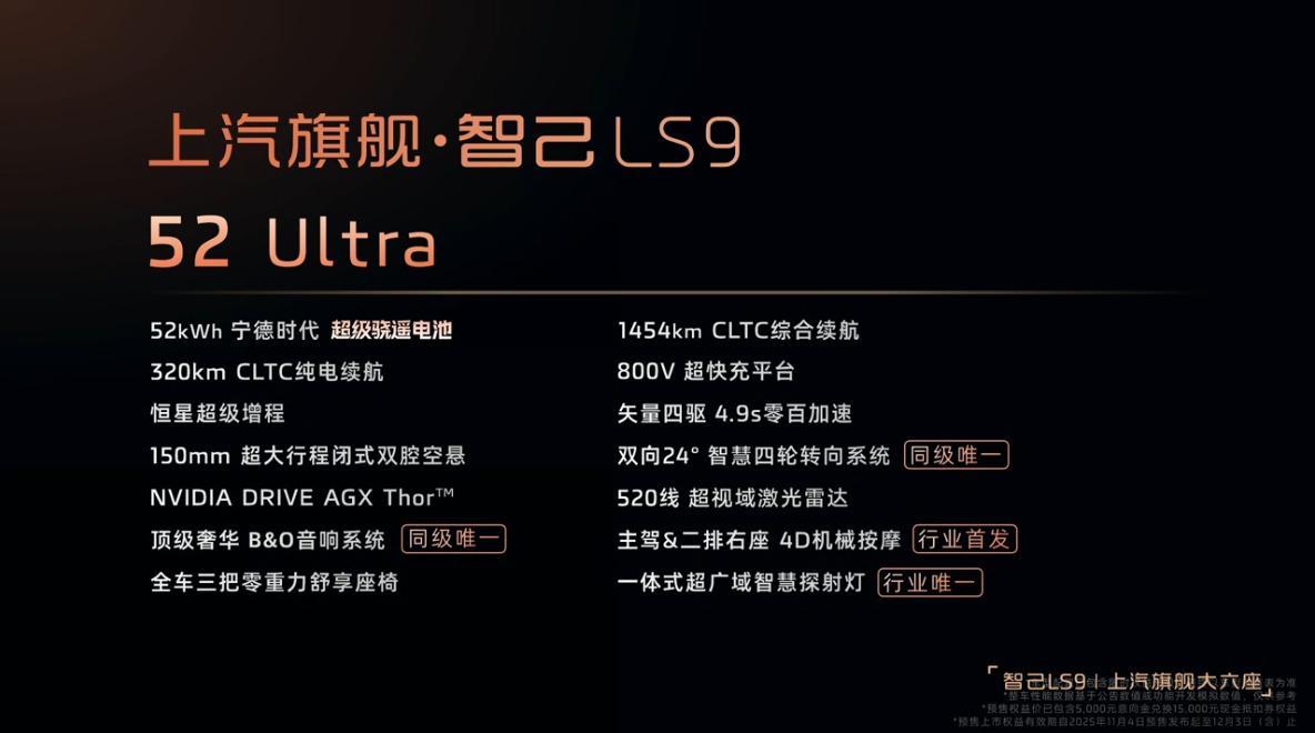 智己LS9卖33.69-36.69万,满配了,可以竞争过领克900吗? 智己LS9这台车的整体参数非常不错,该有的都有了,唯一可能不如领克900的就是第三排空间和选装座椅,这点是有很明确的优势的。但智己LS9的后排转向、双腔空悬、三个零重力座椅,都是配置亮点。还有25扬声器等等,可以说配置是不输领克900的。你们说智己这台车,能打得过这一级别的领头羊领克900吗? 下面是智己LS9的参数: 规格:5279*2000*1806mm,轴距:3160mm(中大型SUV) 驱动形式:增程(前后双电机四驱) 汽油标号:92 布局:2+2+2 发动机:1.5T 发电机功率:390kW 电池:磷酸铁锂/三元锂 电池容量:52kWh/66kWh 充电平台:800v CLTC续航:402km 百公里加速:4.9S 悬架:前双叉臂后多连杆+双腔空悬+CDC(150mm调节) 智驾硬件:1*520线激光雷达 智驾芯片:Nvidia Thor-U 颜色:外黑/蓝/灰/银 轮毂:22/23寸轮毂 屏幕:27.1主驾屏+15.6副驾屏+21.5后排娱乐屏 座椅:Nappa真皮座椅、三零重力座椅(副驾、二排两个)+前后排座椅通风加热+前后排按摩(前左后右为机械按摩) 其他配置:一体式探照灯、B&O 25扬、后轮转向、前后排双层夹胶玻璃、二排遮阳帘+小桌板、双开门冰箱(0-50°C)、电踏板、电吸门、50w无线充*2、360影像+透明底盘、15氛围灯、瞬净新风、电动踏板 33.69万 52 Ultra 320km/52度/4.9s零百/800v 36.69万 66Ultra 402km/66度//800v 全车智慧关门 PS:(两个配置差距,主要是续航和全车智慧关门的差距,其他主要配置一致,所以选择上,根据自身需求来就OK) (未公布)Hyper版 三电机四驱/零百3s/线控转向 选装: 9800元 外观折扣基金 36000元 IMAD驾驶辅助首任车主免费 5600元 电池包终身质保 现金礼: 5000元抵扣15000元(总价已包含) 11.25日前下订兜低购置税1.5万【来自懂车帝车友圈】