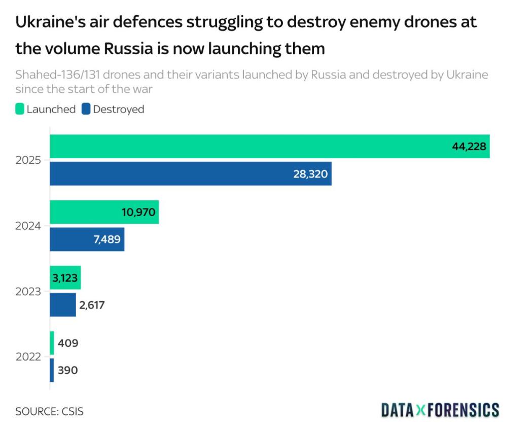 【俄罗斯大幅增加无人机袭击】不到一年时间,俄罗斯向乌克兰发射的“沙赫德”无人机数量已经是2024年全年发射数量的四倍。天空新闻援引战略与国际研究中心的数据报道了此事。总计已发射约44,000架攻击型无人机。乌克兰击落了其中约64%的敌机。这比一年前的拦截率68%要低。俄罗斯不仅启动了国内生产(叶拉布加的无人机工厂),而且还通过灰色市场渠道建立了外国零部件的供应。