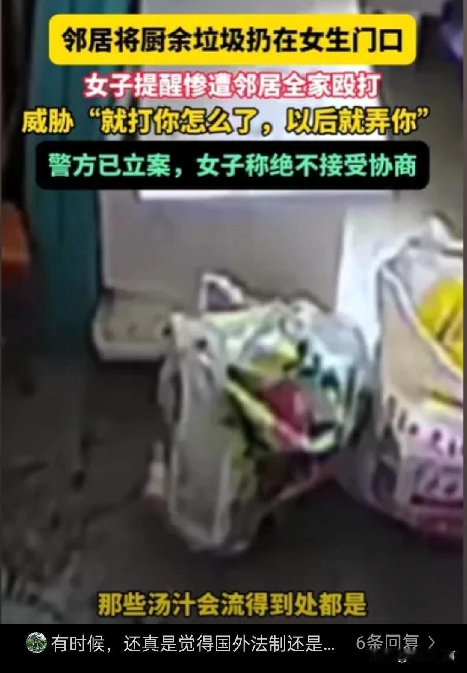 上海一小区,邻居把厨房垃圾丢在他人家门口,垃圾袋破损导致汤汁渗漏,地面污渍斑斑、恶臭难闻。住户见状提醒不要在此处堆垃圾,一名八旬老人突然暴怒冲出,用力推搡住户,还谎称被对方推打。随后老人50多岁的儿子冲出,揪住住户衣领往自家拖拽。住户告知门口有监控,却遭对方全家拳打脚踢,有人持棍参与殴打,即便民警到场,住户仍被额外打了一拳。 住户全程未还手,担心老人倒地引发更复杂纠纷,直到被抬上救护车才敢落泪,明确不愿协商和解。 法律上,乱堆垃圾侵害他人合法权益,需承担民事责任;殴打他人造成轻微伤属违法行为,轻伤及以上则构成故意伤害罪,需负刑事责任。住户可依法要求赔偿医疗费、护理费等合理费用。 邻里相处应互谅互让、遵守公序良俗,冲动施暴、恶意侵权的行为,终将受到法律制裁。