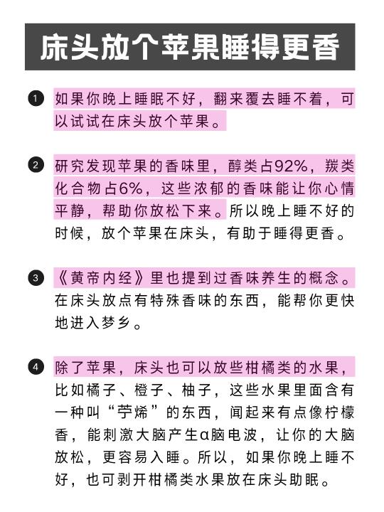 研究发现苹果的香味里,醇类占92%,羰类化合物占6%,这些浓郁的香味能让你心情平静,帮助你放松下来。所以晚上睡不好的时候,放个苹果在床头,有助于睡得更香。 《黄帝内经》里也提到过香味养生的概念。在床头放点有特殊香味的东西,能帮你更快地进入梦乡。 除了苹果,床头也可以放些柑橘类的水果,比如橘子、橙子、柚子,这些水果里面含有一种叫“苧烯”的东西,闻起来有点像柠檬香,能刺激大脑产生α脑电波,让你的大脑放松,更容易入睡。所以,如果你晚上睡不好,也可剥开柑橘类水果放在床头助眠。