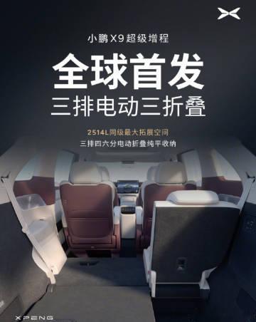 小鹏首款增程车小鹏X9增程版马上就要发布了 这次新车还有一个“三折叠”的新特性 新车的第三排座椅支持电动调节,能180°完全躺平,也可以完整地沉到地台下面,给你变出一个1米8乘以1米6的纯平空间【来自懂车帝车友圈】