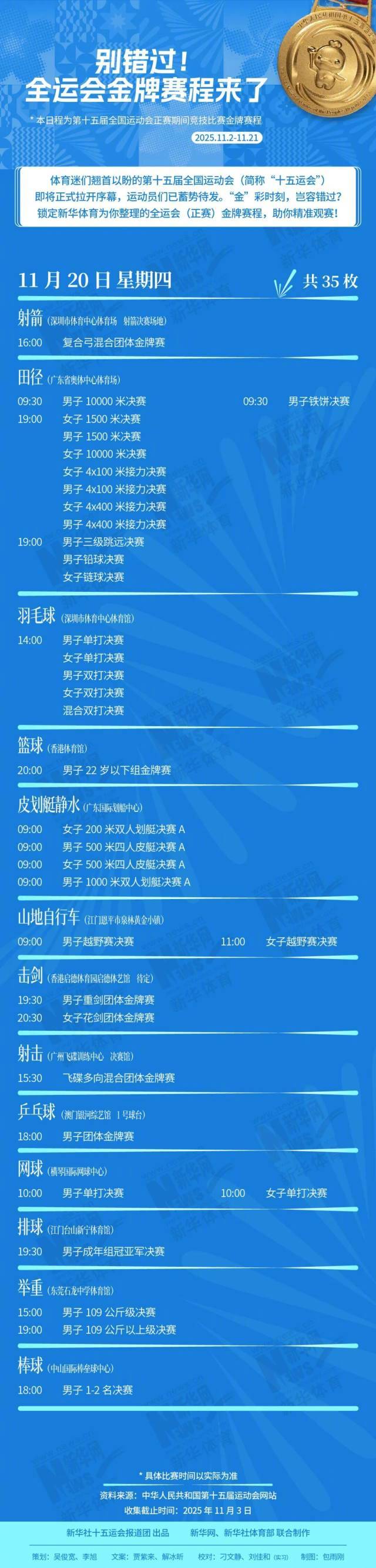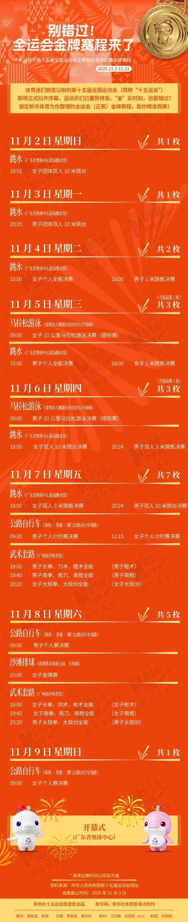 【别错过!这届#全运会金牌赛程来了#】体育迷们翘首以盼的第十五届全国运动会(简称“十五运会”)即将正式拉开序幕,运动员们已蓄势待发。“金”彩时刻,岂容错过?为你整理的全运会(正赛)金牌赛程,助你精准观赛!(中华人民共和国第十五届运动会网站)