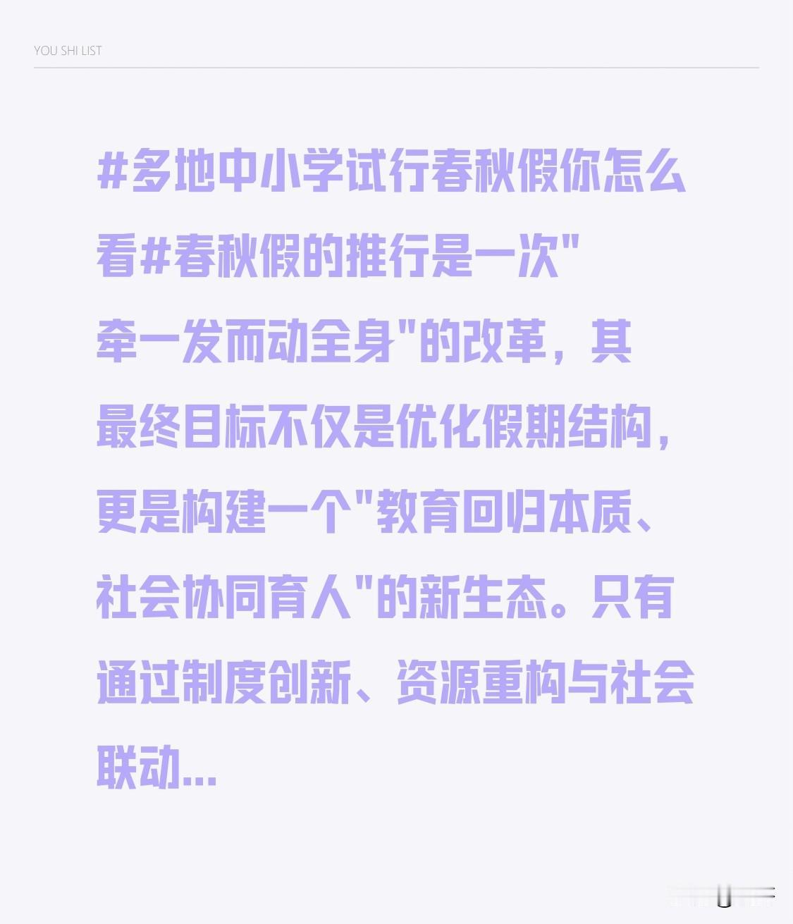 多地中小学试行春秋假你怎么看春秋假的推行是一次"牵一发而动全身"的改革,其最终目标不仅是优化假期结构,更是构建一个"教育回归本质、社会协同育人"的新生态。只有通过制度创新、资源重构与社会联动,才能让这一政策真正成为促进学生全面发展、推动社会进步的重要引擎。