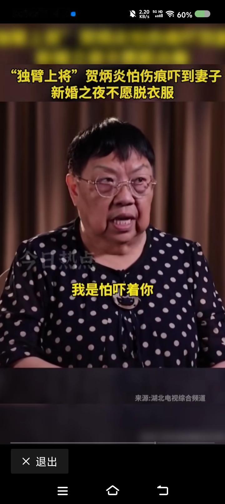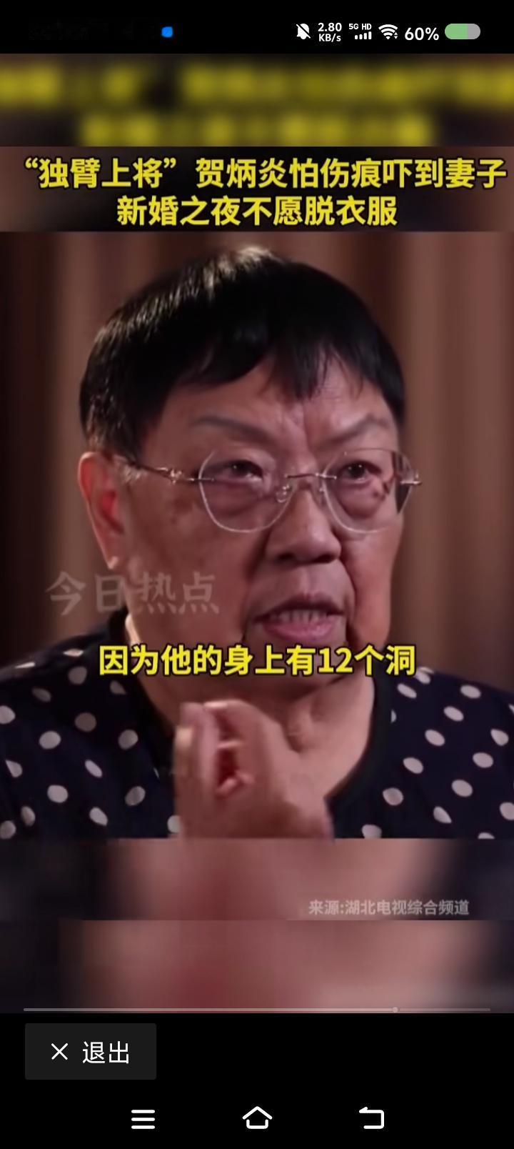 “独臂将军”贺炳炎对新婚妻子说—— 网上视频:贺炳炎的女儿说:“爸爸新婚之夜不脱