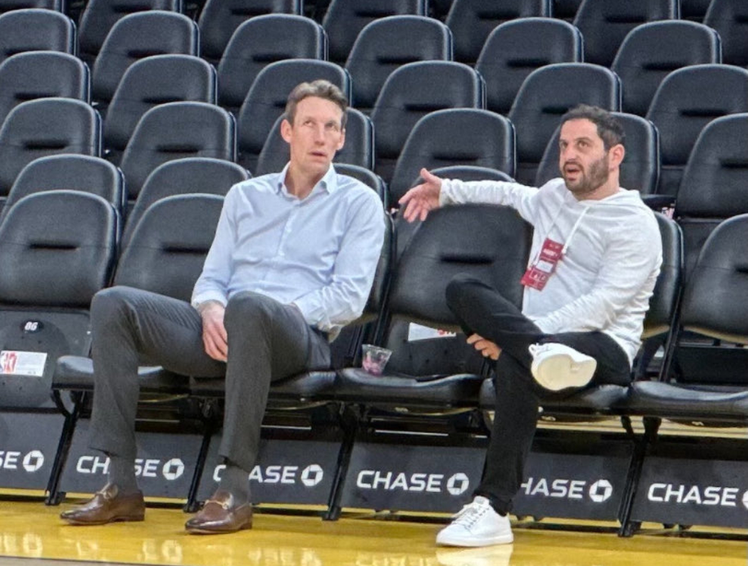 勇士队总经理迈克·邓利维正在与乔纳森·库
