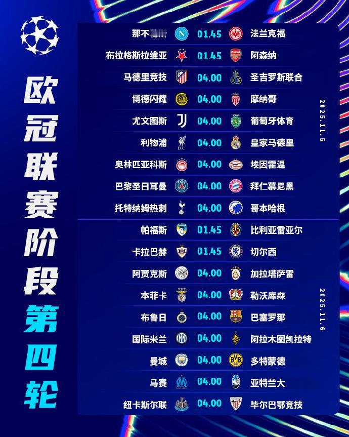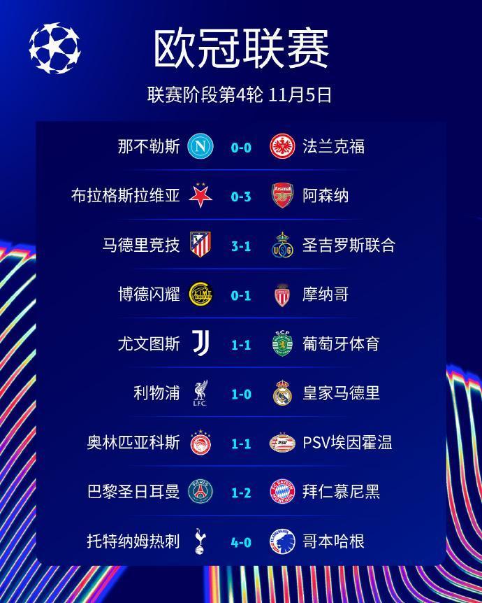 足球:2025欧冠联赛阶段第4轮第1比赛日赛果,明天凌晨赛程看图。