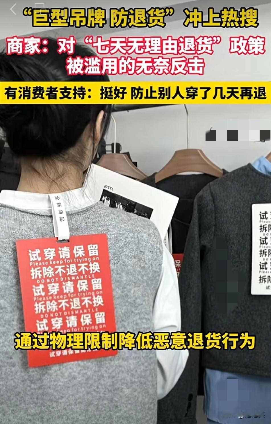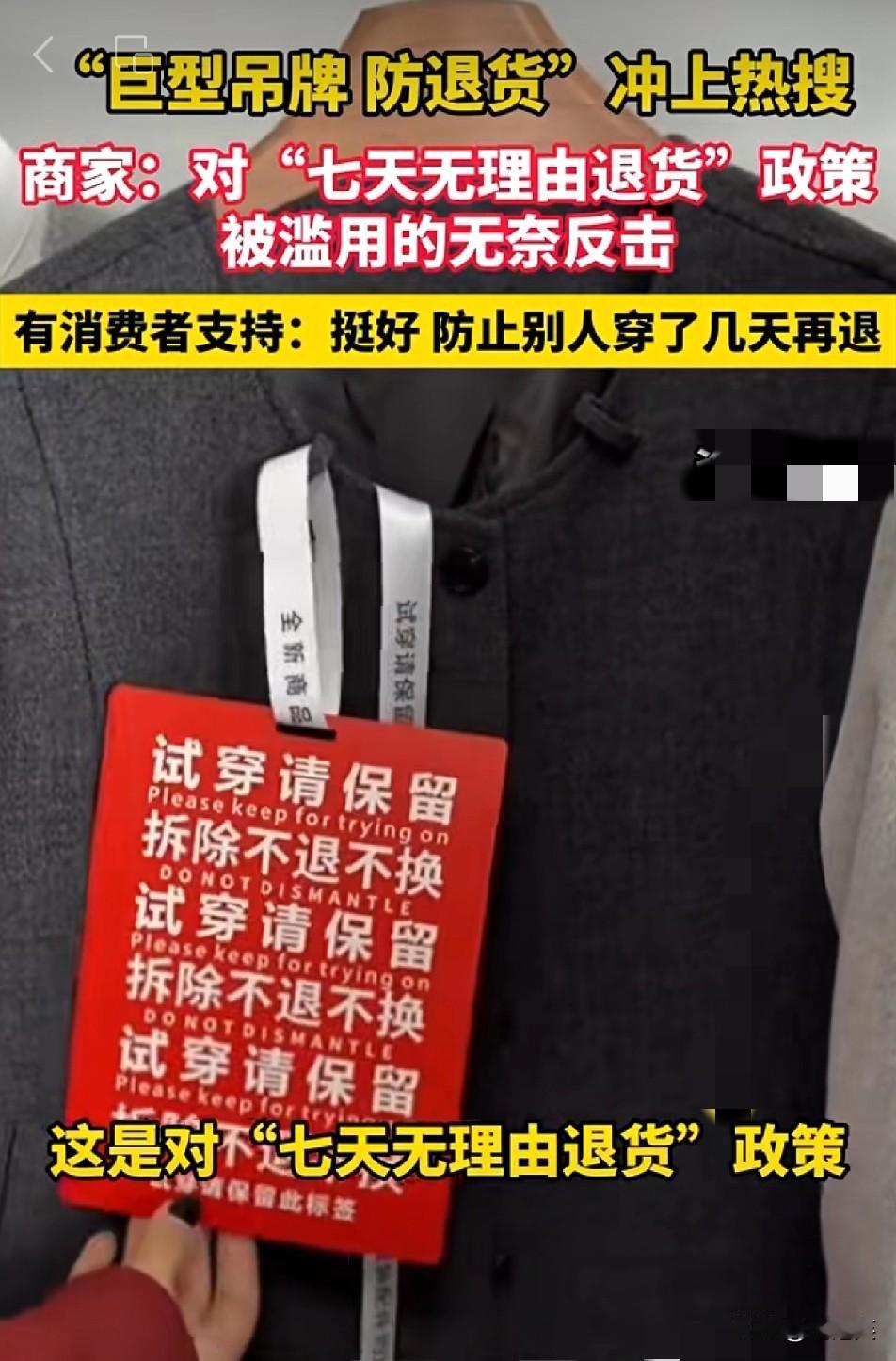 绝了! 商家出“巨型吊牌防退货”,这波操作把消费者看懵了 “巨型吊牌防退货”冲上热搜! 商家为了反击“七天无理由退货”被滥用,搞出了材质坚硬、足有A4大小的巨型吊牌 上面写着“拆除不退不换” 有消费者支持,觉得这能防止有人穿了几天再退 但也有人觉得这操作太极端 其实这背后是商家对恶意退货的无奈,毕竟有些退货回来的衣服都被穿脏了 商家损失不小 现在网购退货率居高不下,商家这波操作也是被逼出来的 要是你碰到这种吊牌,还会买吗